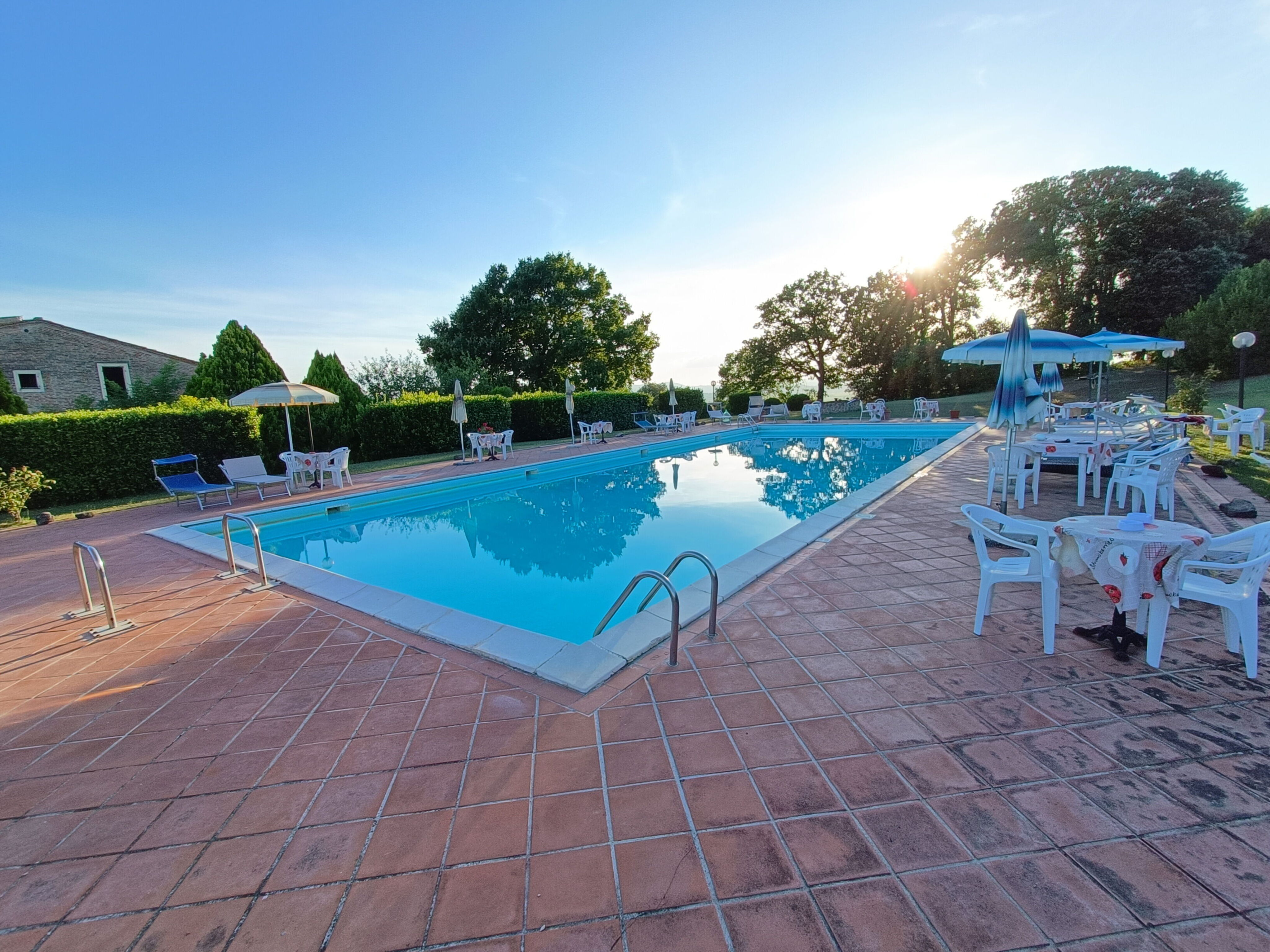 Mooi groot zwembad en ligstoelen.