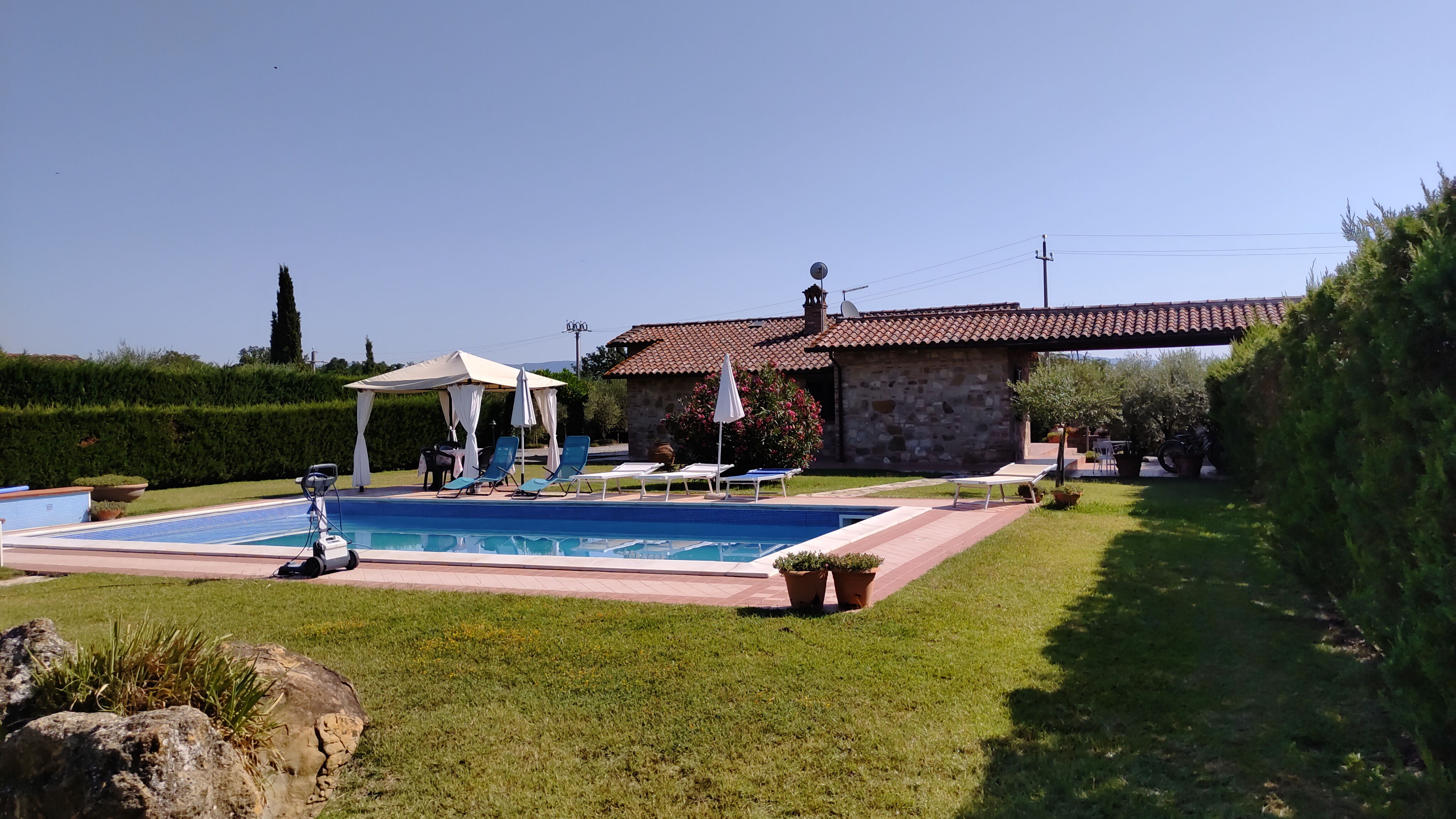 Beautiful Villa in a lovely quiet location not far from Castiglione del Lago. Clean, well cared for (pool cleaned by the owner early each morning) and bigger than we expected, we'll definitely be planning a return trip. Very helpful owner attended to any queries we had. Very hot while we were there (37 degrees) so lack of aircon was felt but wouldn't deter us from returning. Fantastic, relaxing week enjoyed by both adults and kids (they'd spend 24 hours in the pool if they could!).