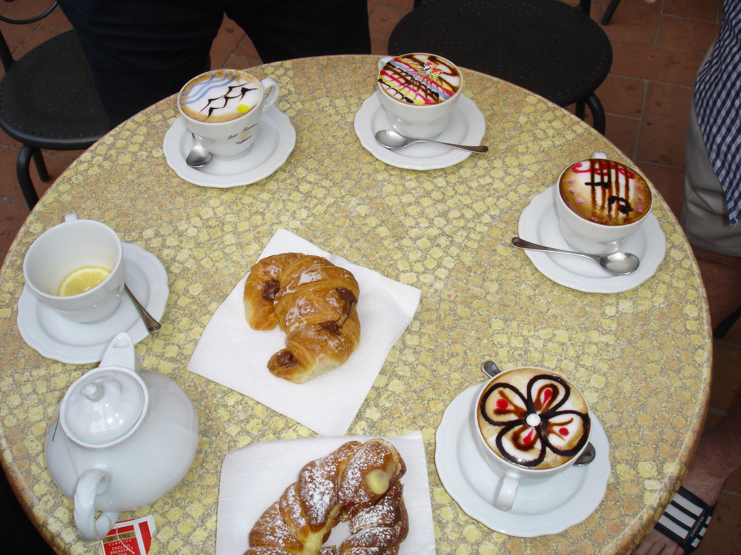 Elio, our host, was a dream. He had gathered maps and tourist brochures and put them on the kitchen table. He sat with us to explain, with glee and pride, the entire area and all the things we could do. He was a lovely man, a former postmaster general, who was retired but enjoyed meeting new people from around the world. And we certainly enjoyed meeting him. At the end of our meeting he asked "Would you like to go see a vineyard?" Of course, we answered yes, and he arranged to take us to his friend's vineyard the next day where he became our tour guide, showed us how all the equipment worked, and how the wine was made. The visit ended in a lovely wine tasting. Finally, the next morning, he took us across the way to the local coffee shop and treated us to a 'special' cappuccino that his friends made especially for us with beautiful colorful designs in the froth (see pictures). Elio was well loved in town and this friendship was extended to us during our entire stay.