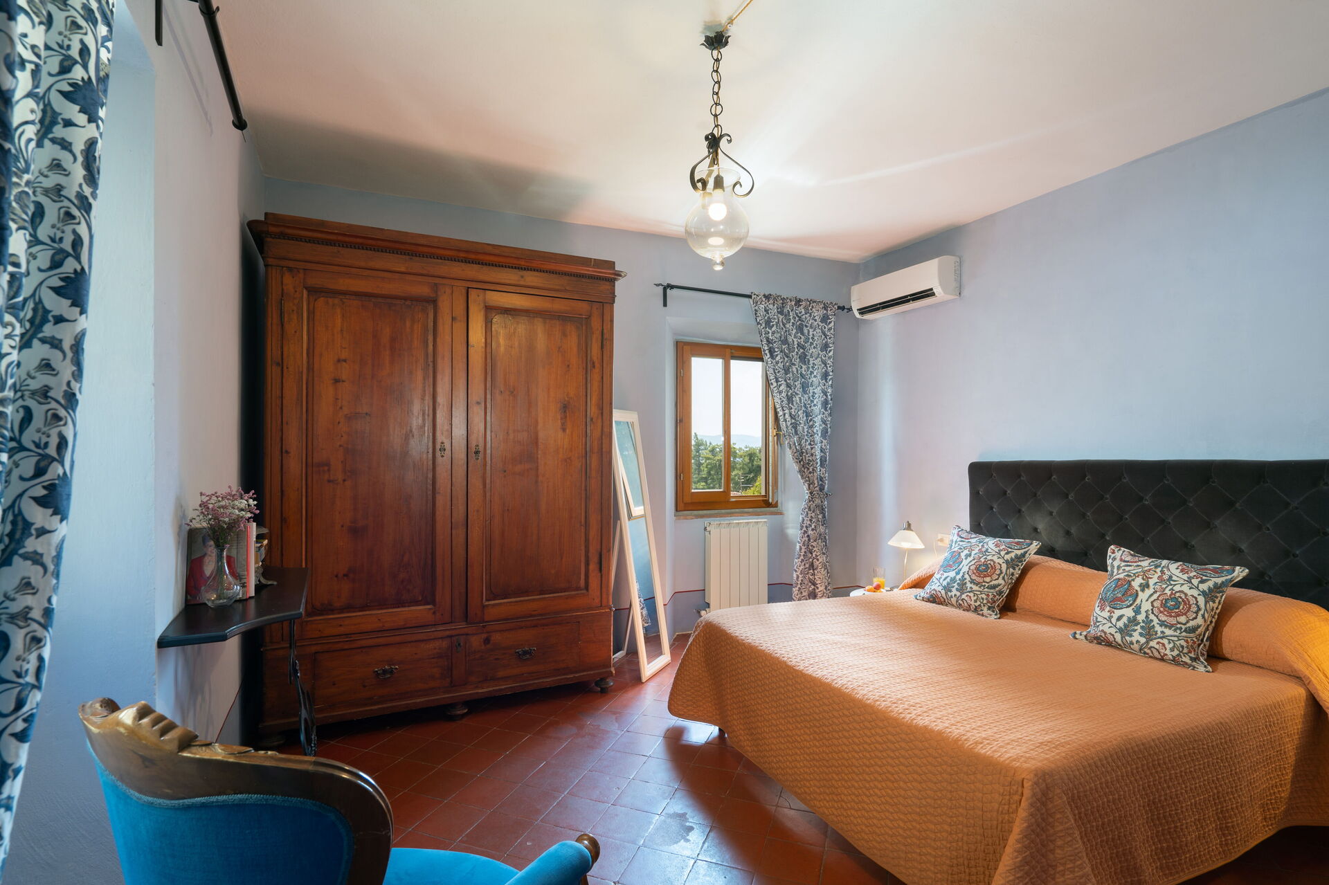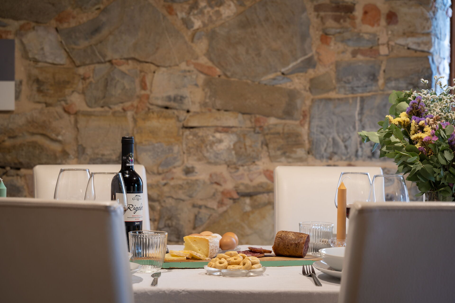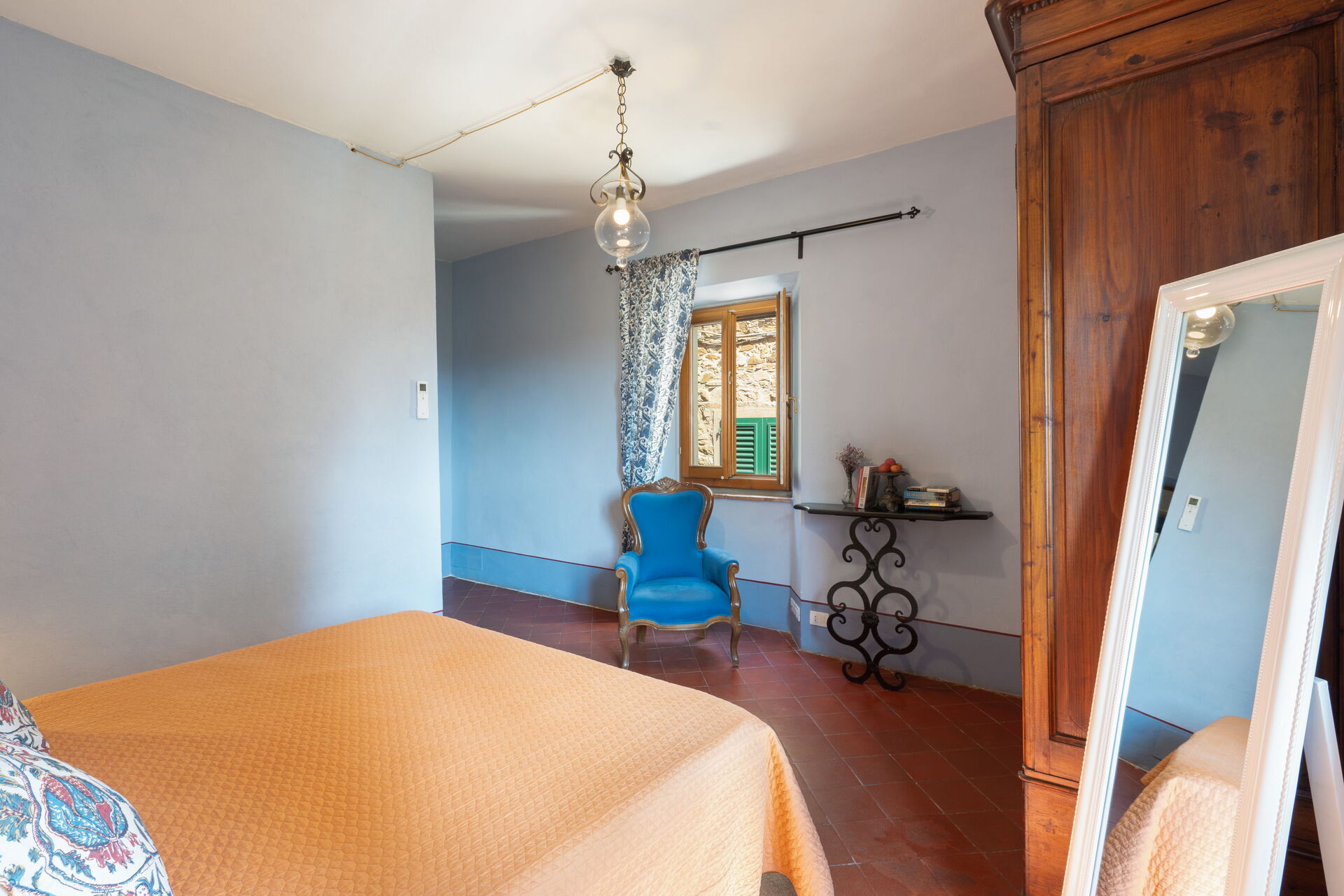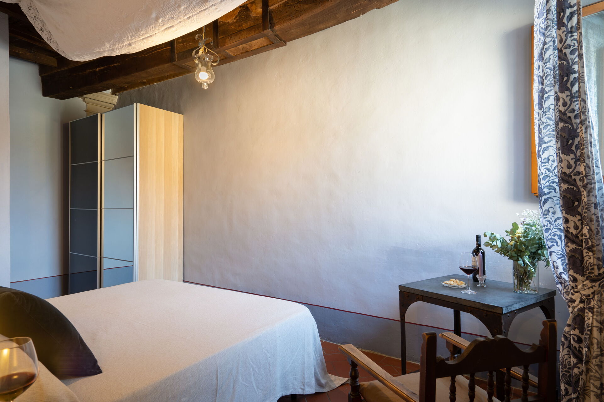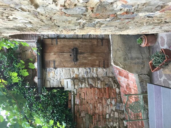 A niche next to the table has several shelves for all dishware, wine glasses and cups. A large wooden table and a wooden cupboard that belongs to our family since generation make this room more authentic.