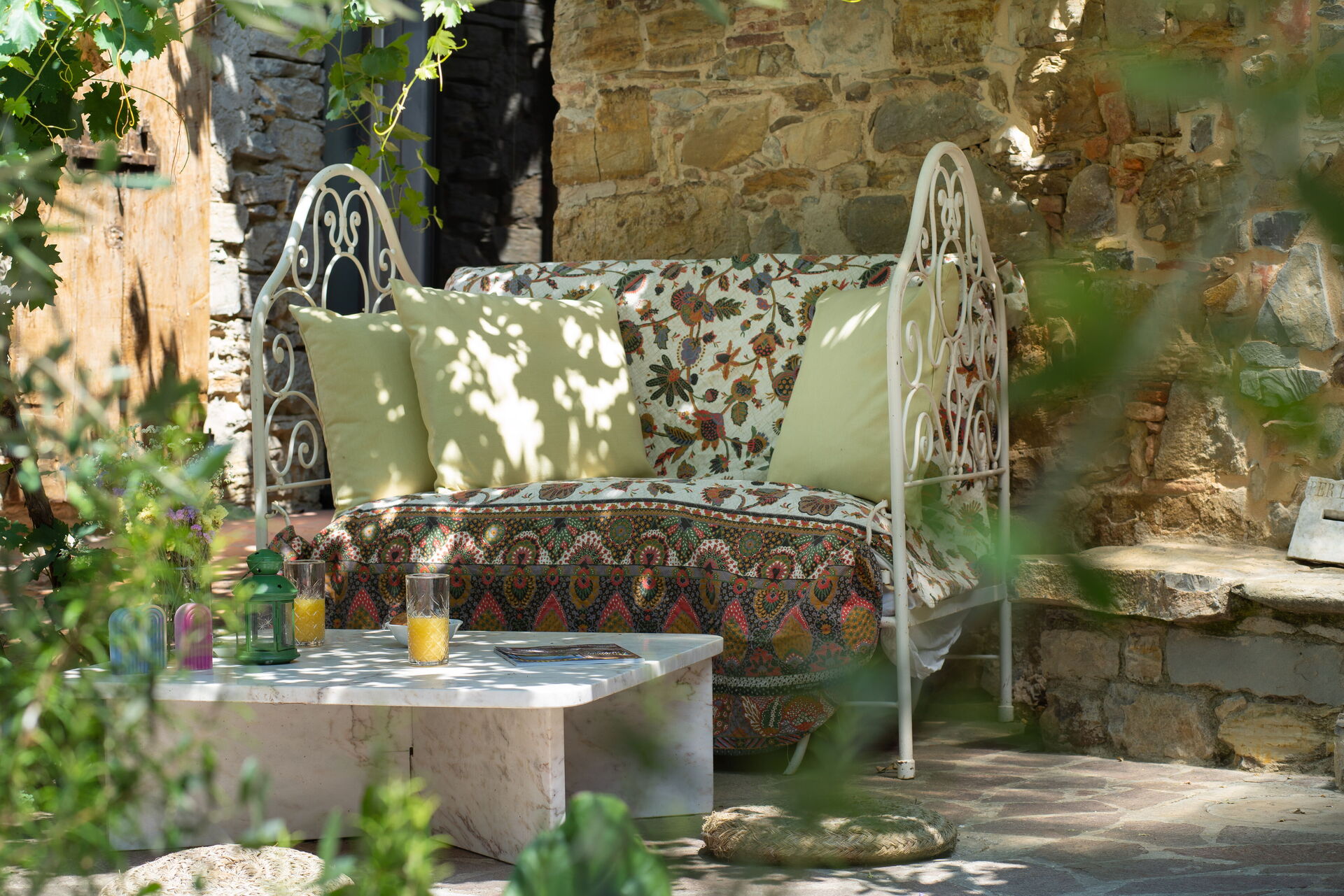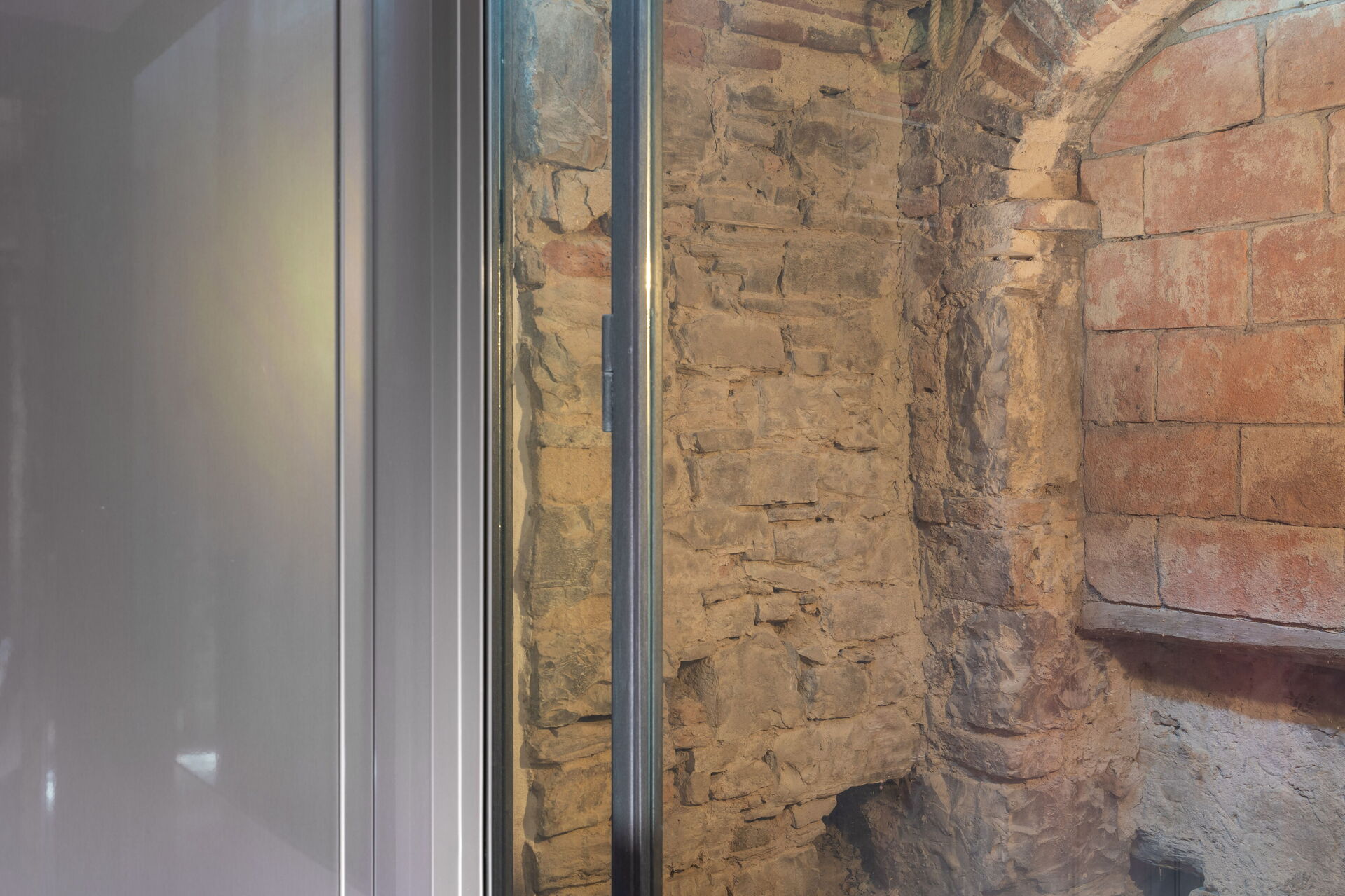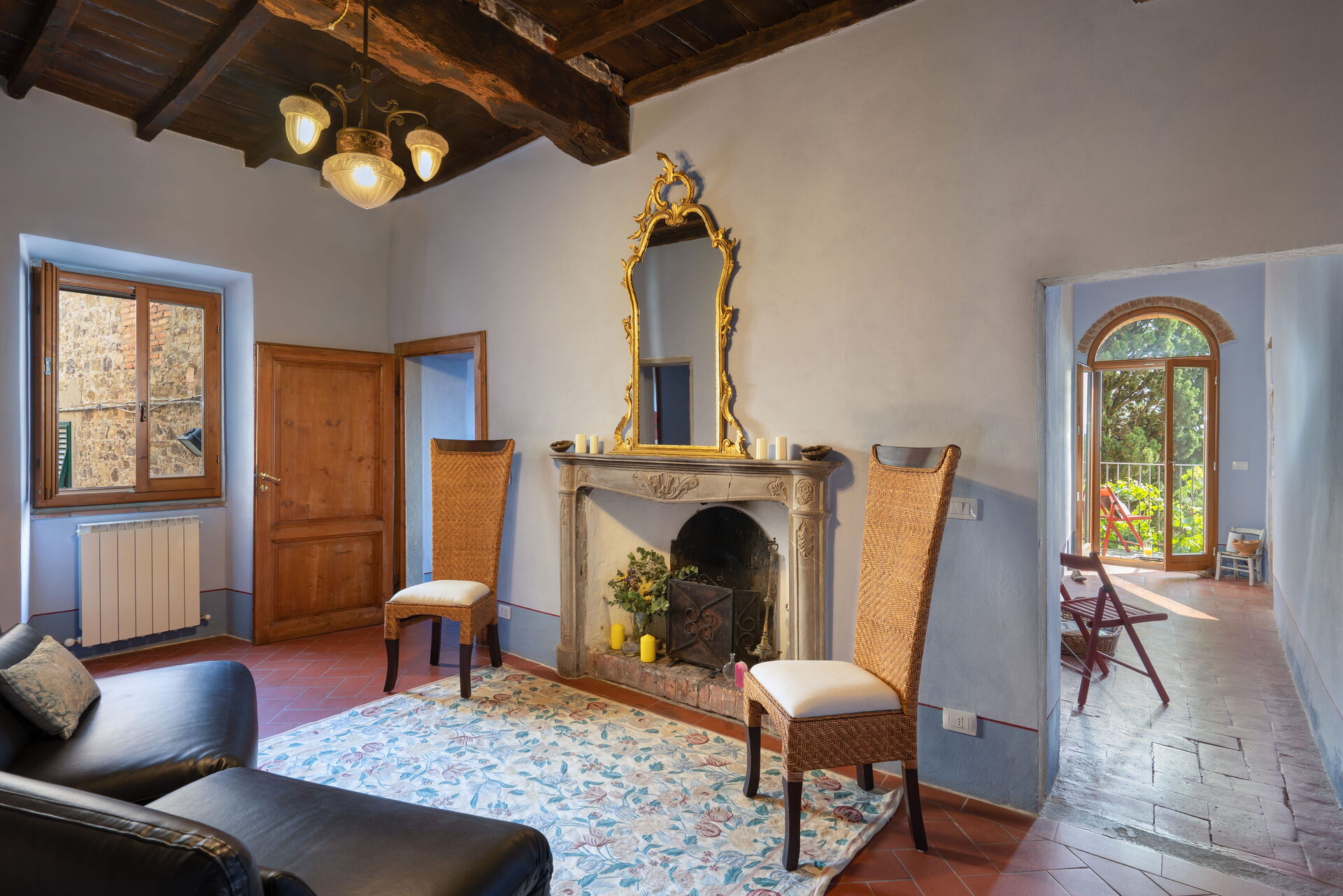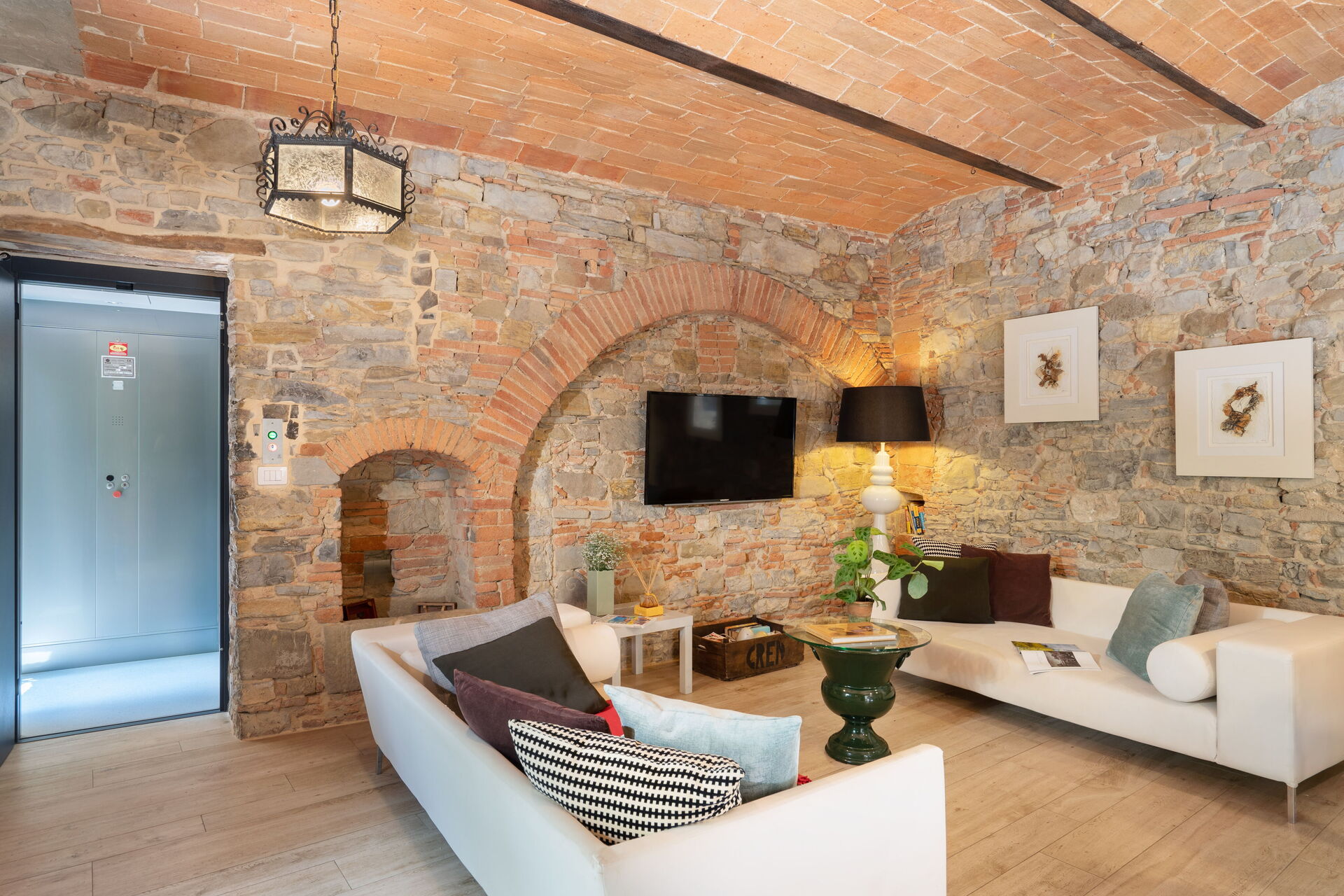 The sitting room is spacious. Very characteristic with stone walls and bricks arches.