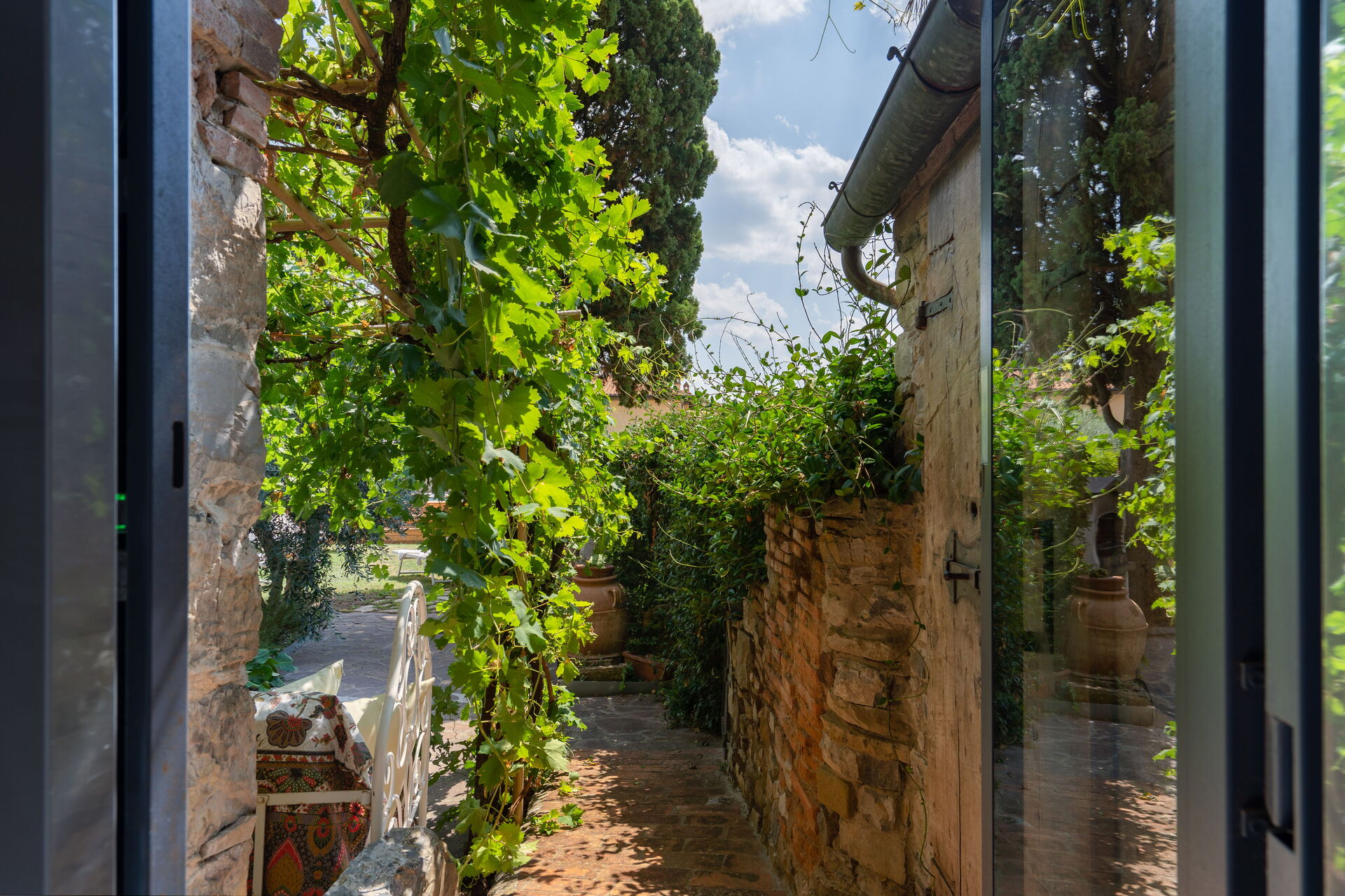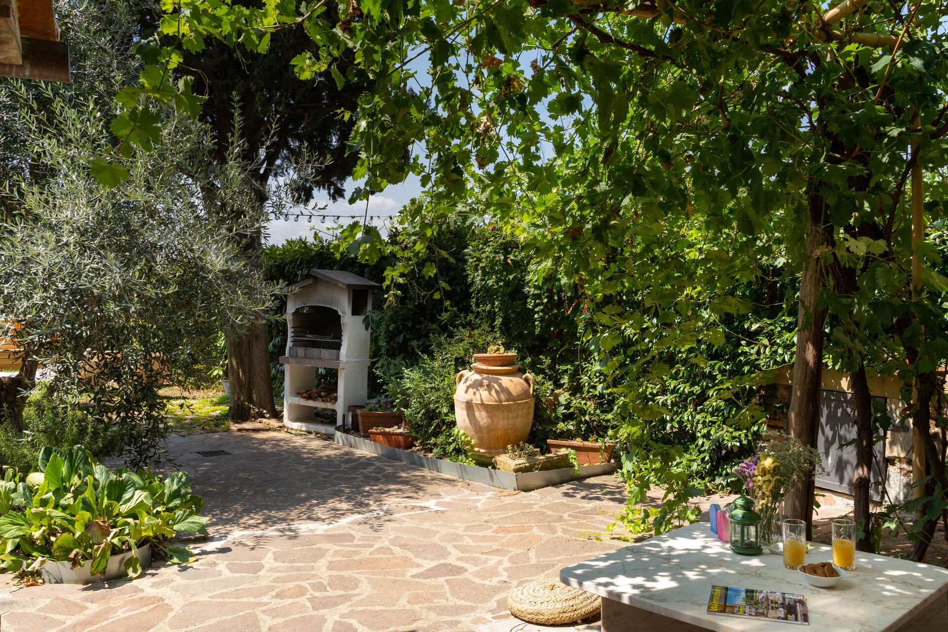 Detrás de la casa hay un jardín privado. ¡Fuera de la puerta hay un patio agradable, cubierto por la parra, con mesa y sillas para disfrutar del almuerzo o de una comida fuera, un espacio para relajarse hay una glorieta elegante justo al lado de un árbol de olivo.