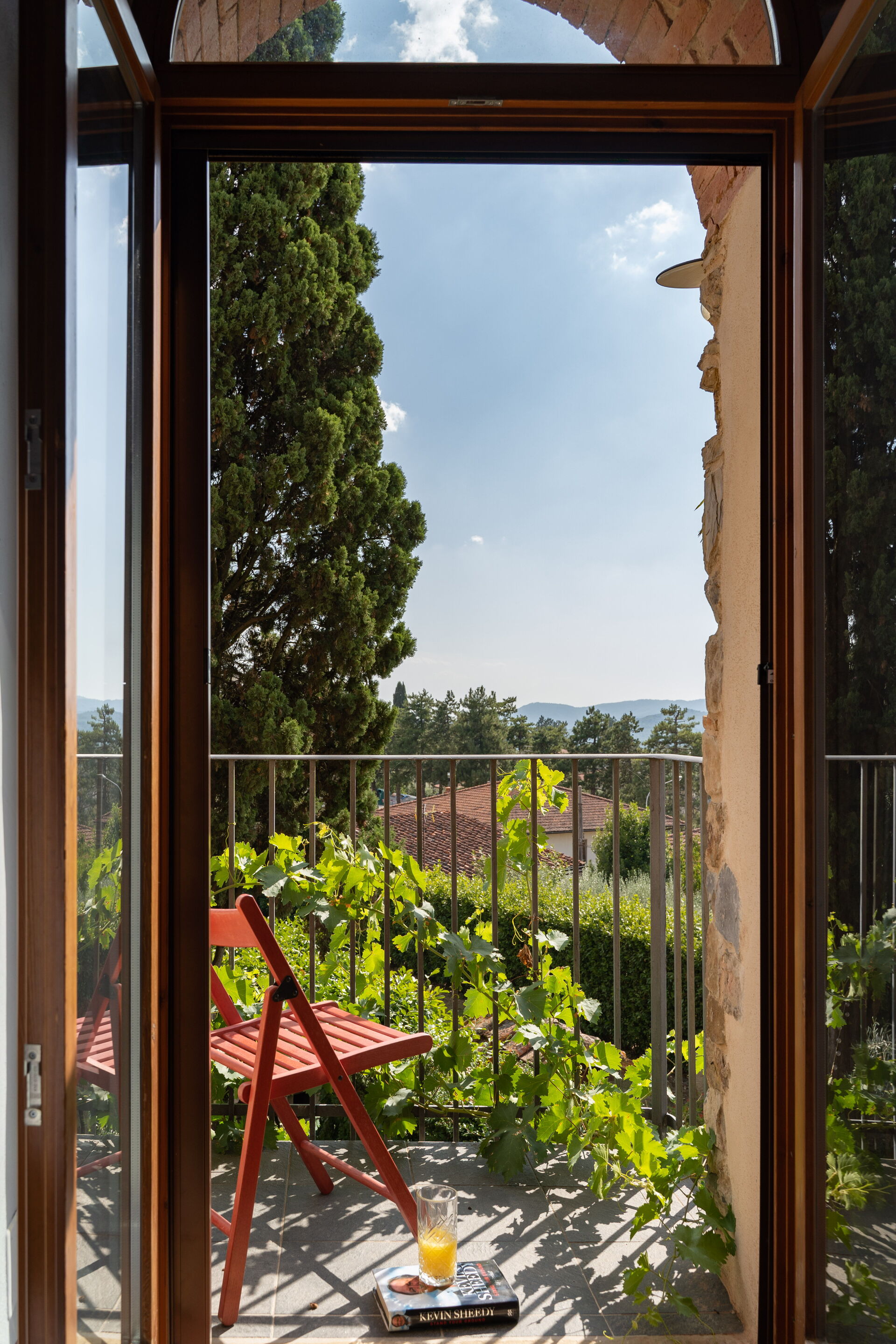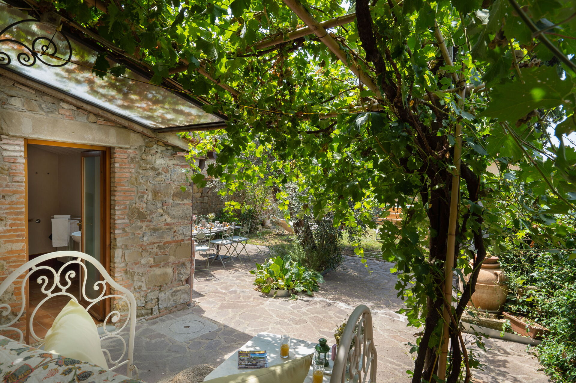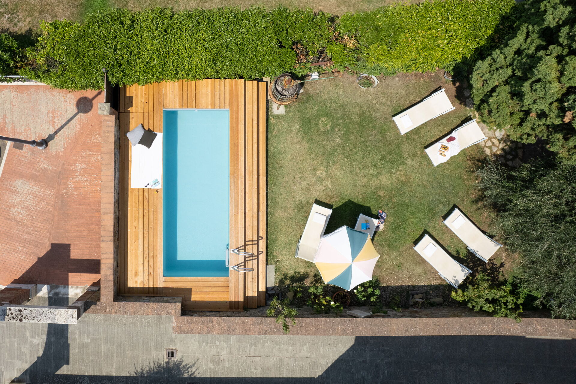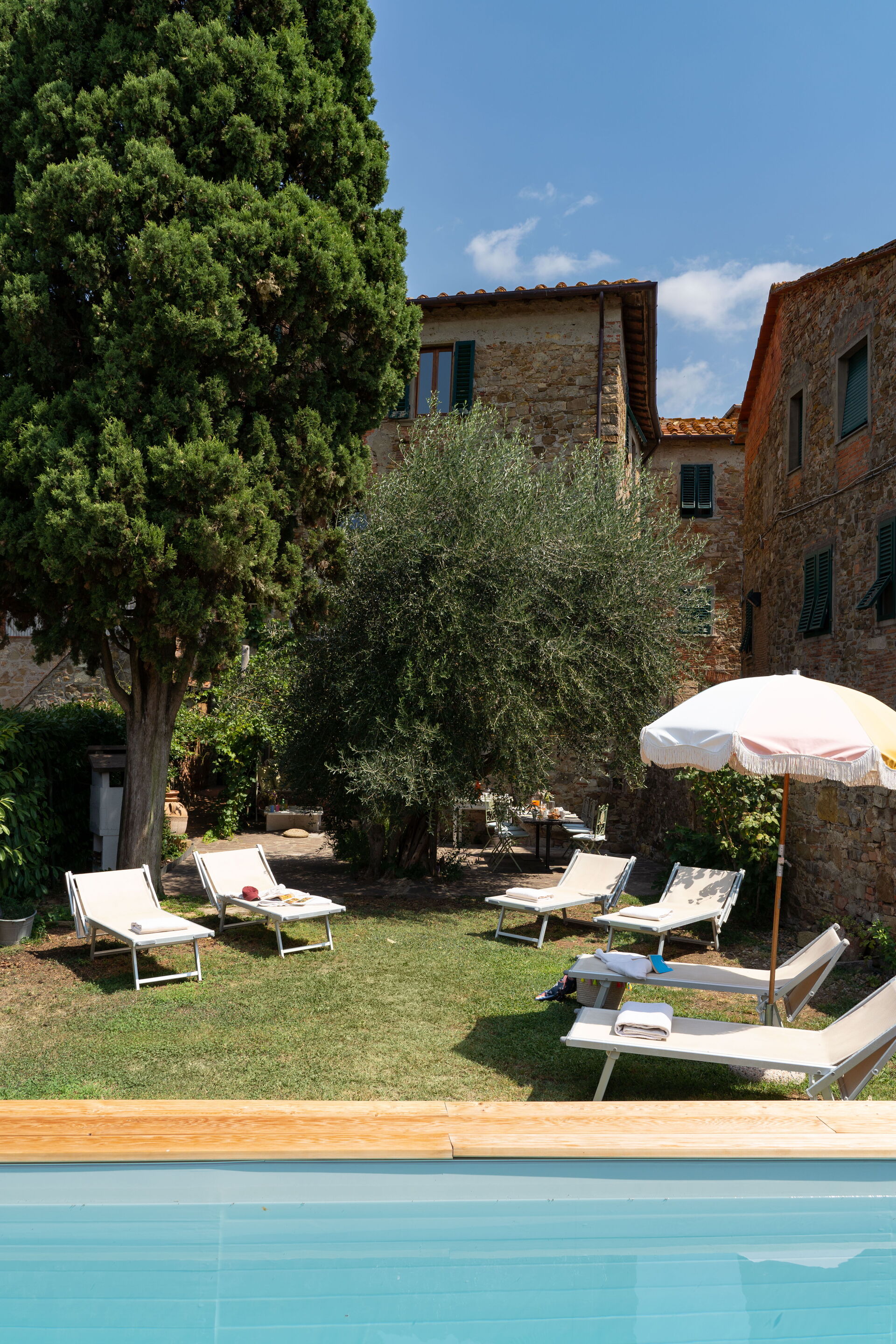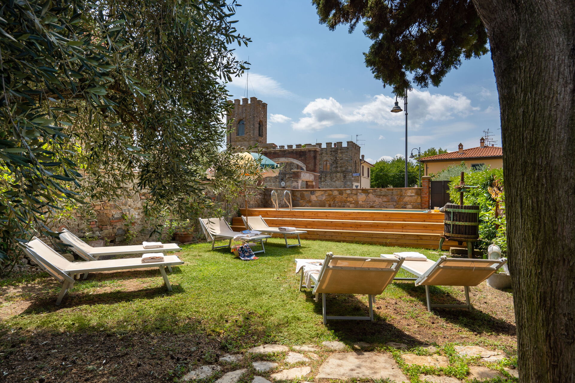 El jardín está cuidadosamente decorado con plantas y árboles frutales, cuenta con una piscina en la parte inferior está rodeado de sillas y tumbonas para disfrutar de nuestro sol de la toscana.
