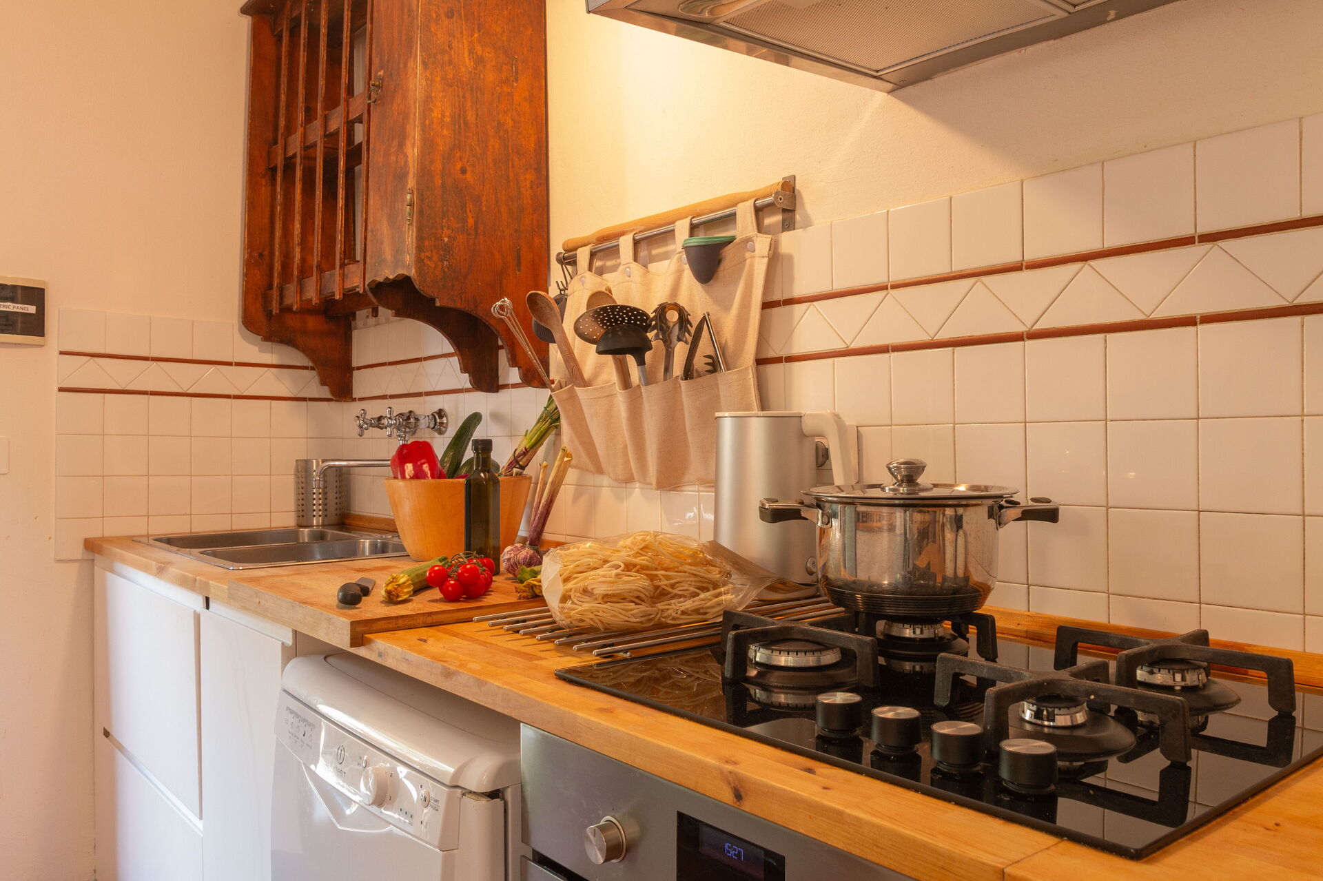 Amplia cocina totalmente equipada (microondas, nevera/congelador, fogones, horno, cafetera/tetera, cubertería, utensilios de cocina y productos básicos como aceite, vinagre, sal, azúcar, café, detergentes);