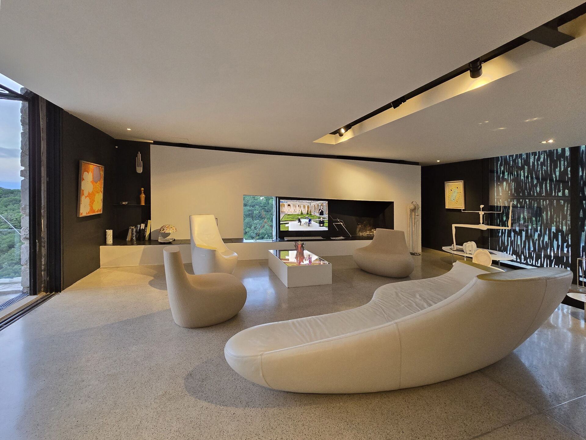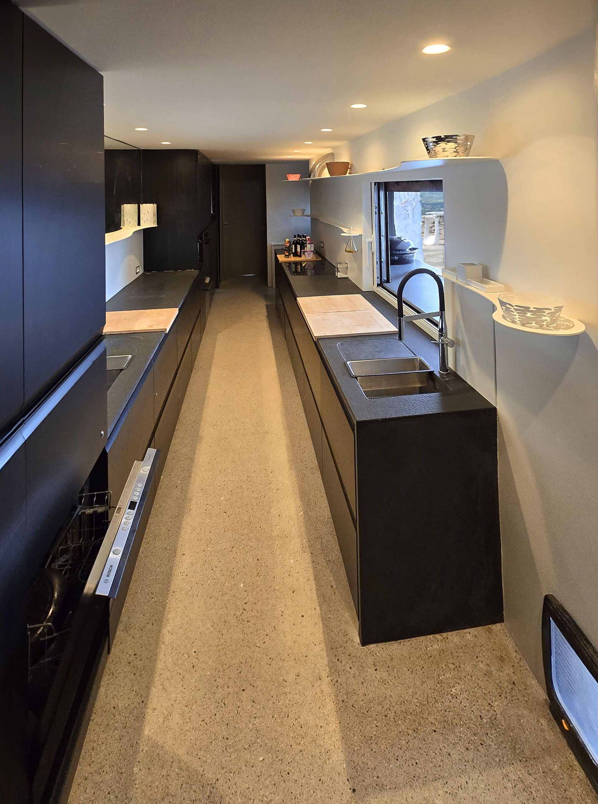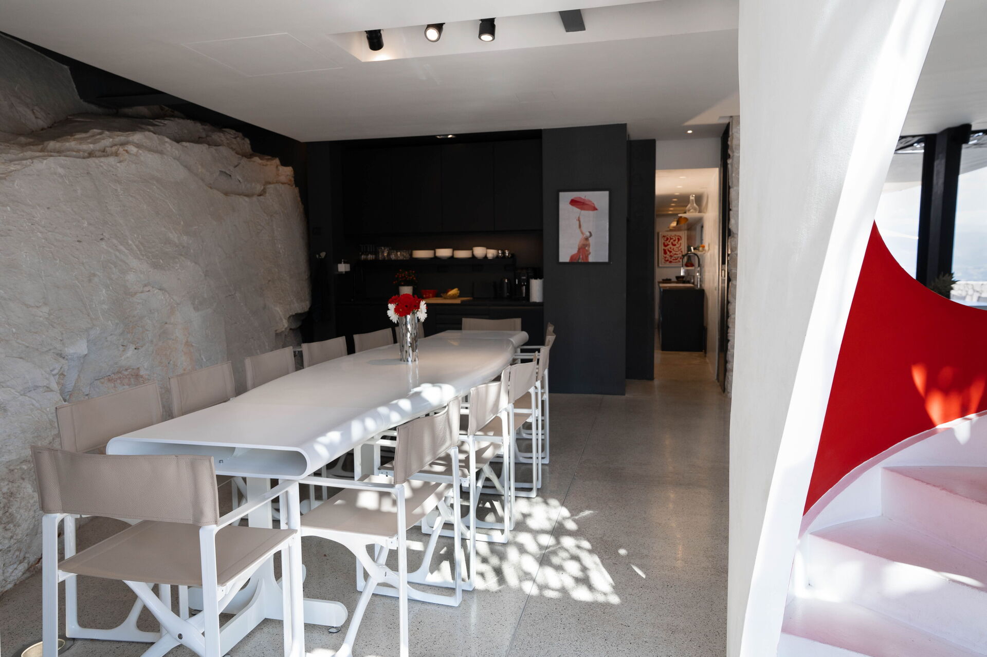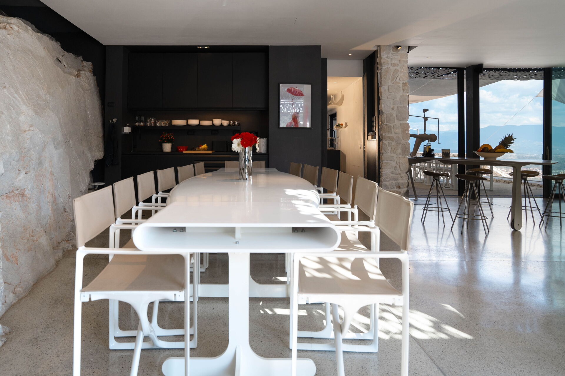 The roof of the main house can be opened to ventilate and cool down the entire building (thanks to a system of hydraulic pistons). The house's special large windows can be opened to unite the indoor and outdoor areas. The furnishing is modern and refined.