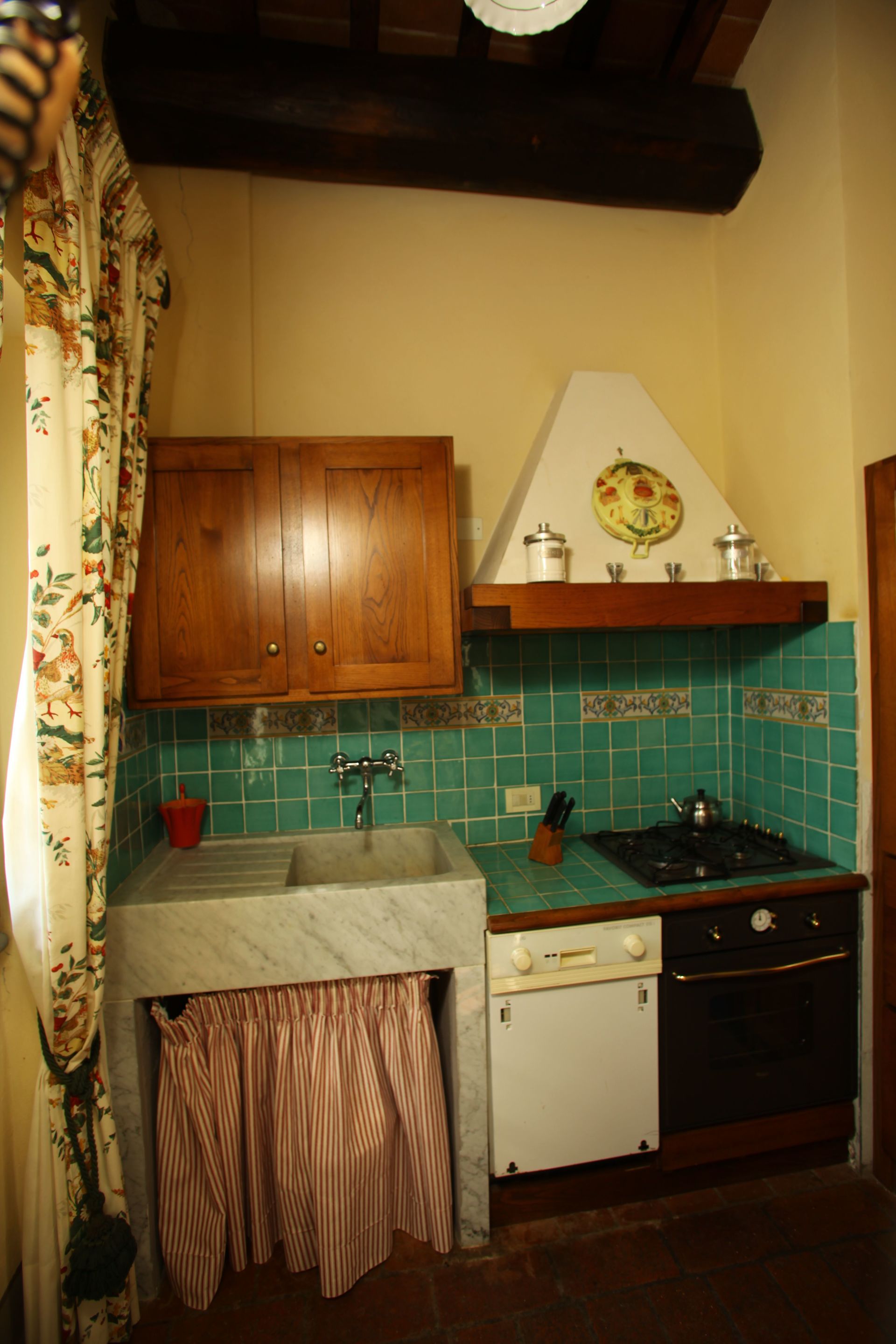 Upstairs, in what was the true hayloft, is a second bedroom with joinable twins and a bathroom identical to the one below. The cottage has some drawbacks: the baths are a bit awkward to use; there is some noise from the little-trafficked adjacent road; and there is currently no phone. There is, however, a washer for the exclusive use of the cottage. We highly recommend Il Fienile; it must be one of the most reasonably priced such accommodations left in Tuscany.