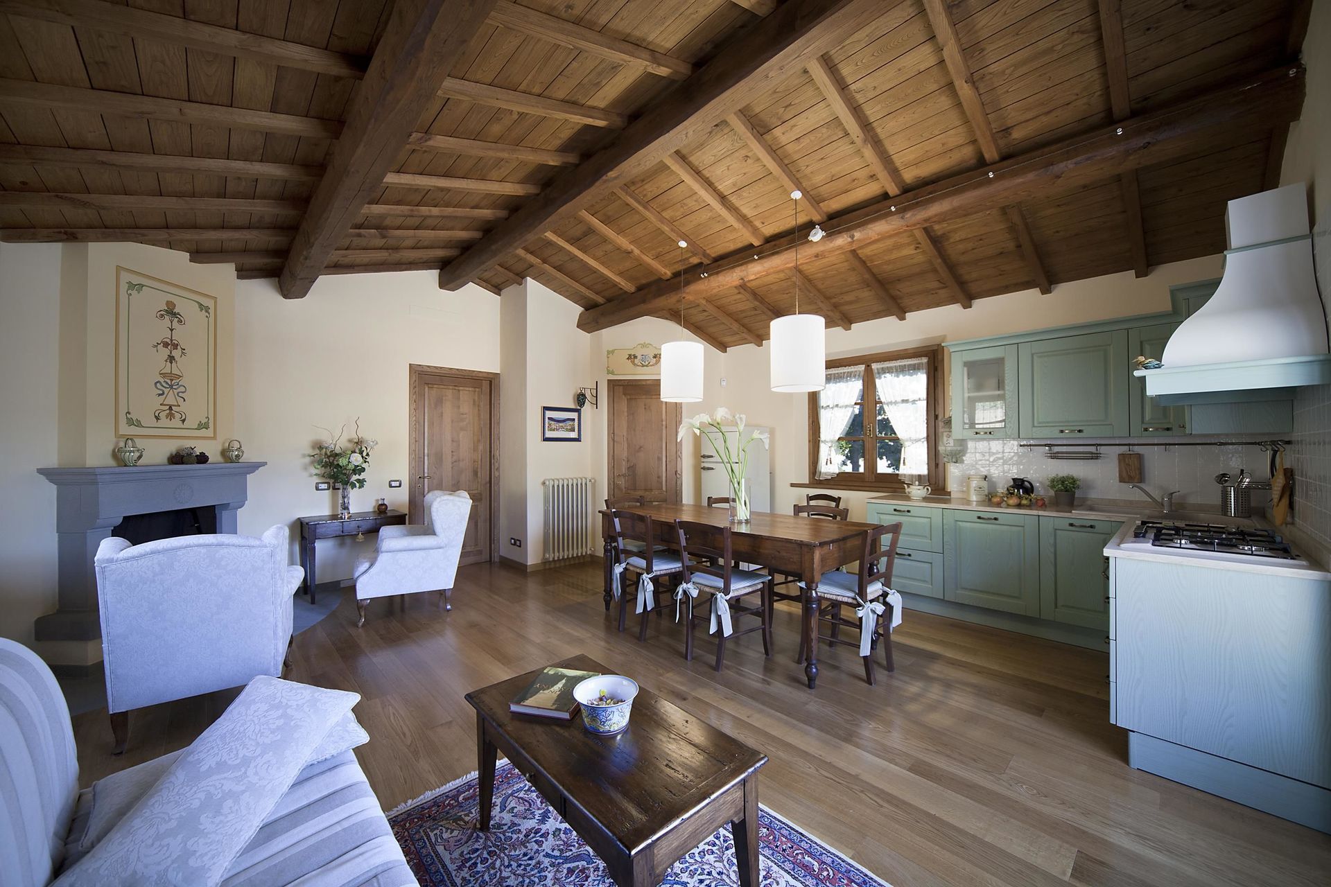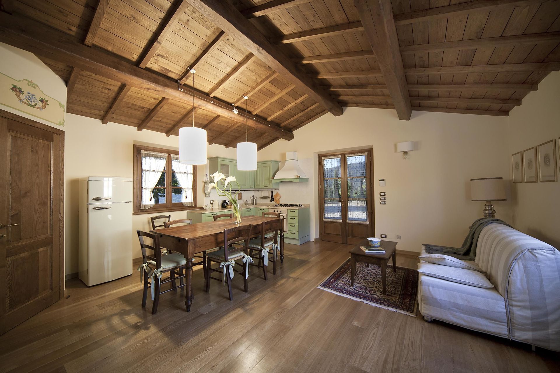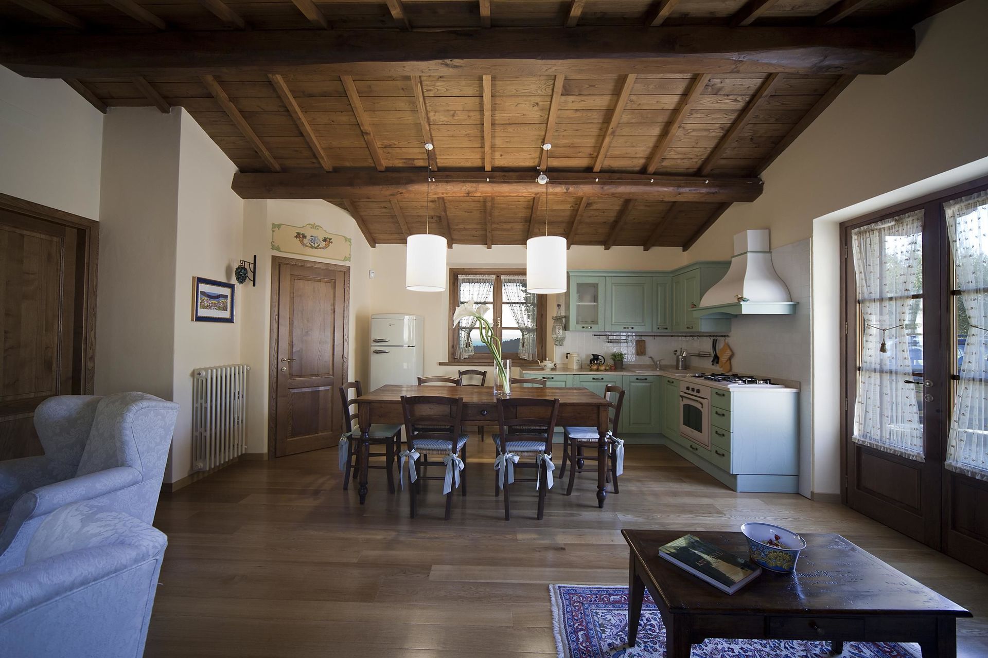 Cocina-salón: cocina bien equipada, mesa de comedor (gente: 6), lavavajillas, frigorífico, congelador, cocina de gas, horno, tostadora, máquina de café italiana, dos sillones, chimenea, sofá cama de matrimonio, WIFI internet, aire acondicionado, tv vía satélite, acceso al jardín.