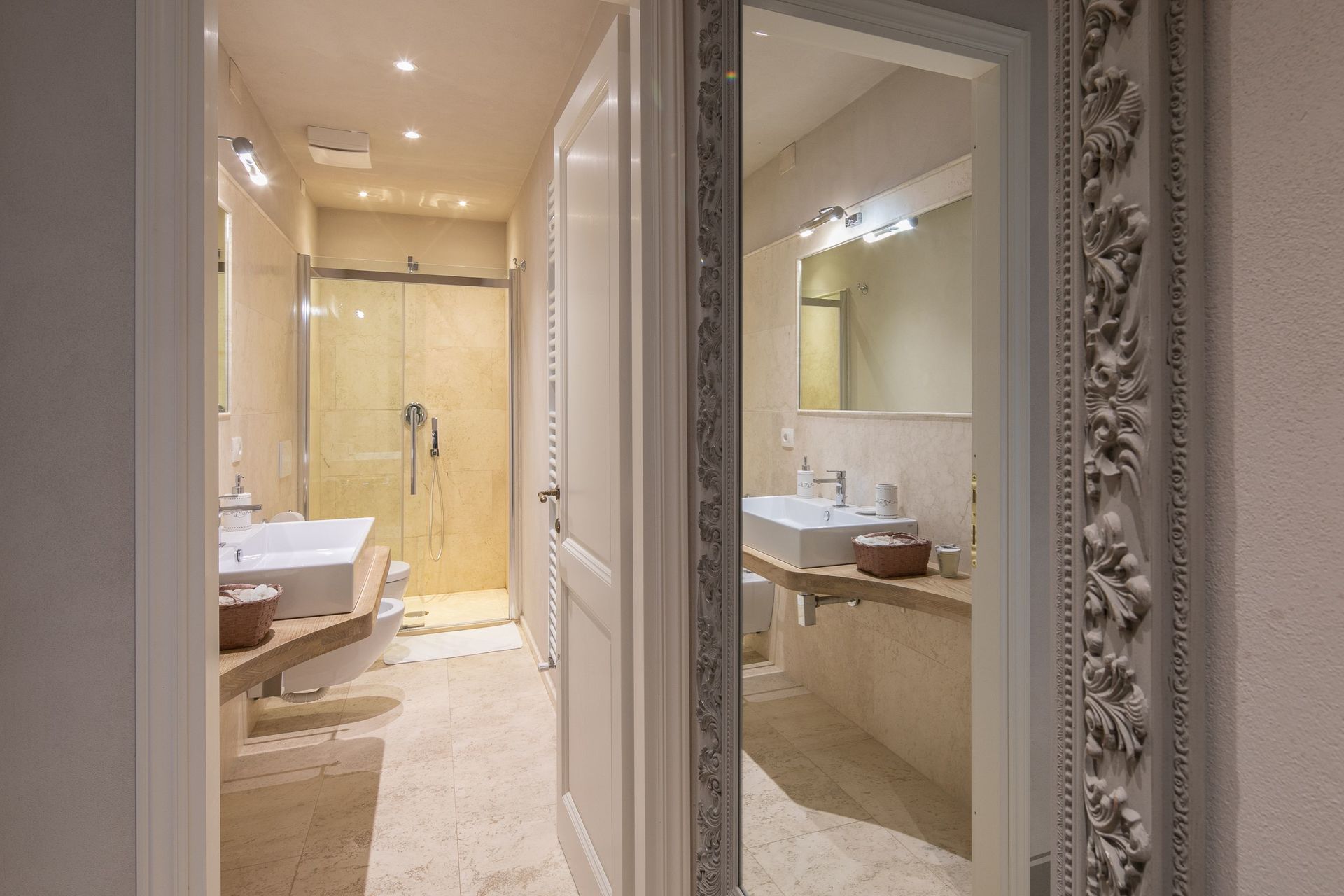 Habitación con baño: cama de matrimonio, mosquitero, lavabo, baño, bidé, ducha, acceso al jardín.