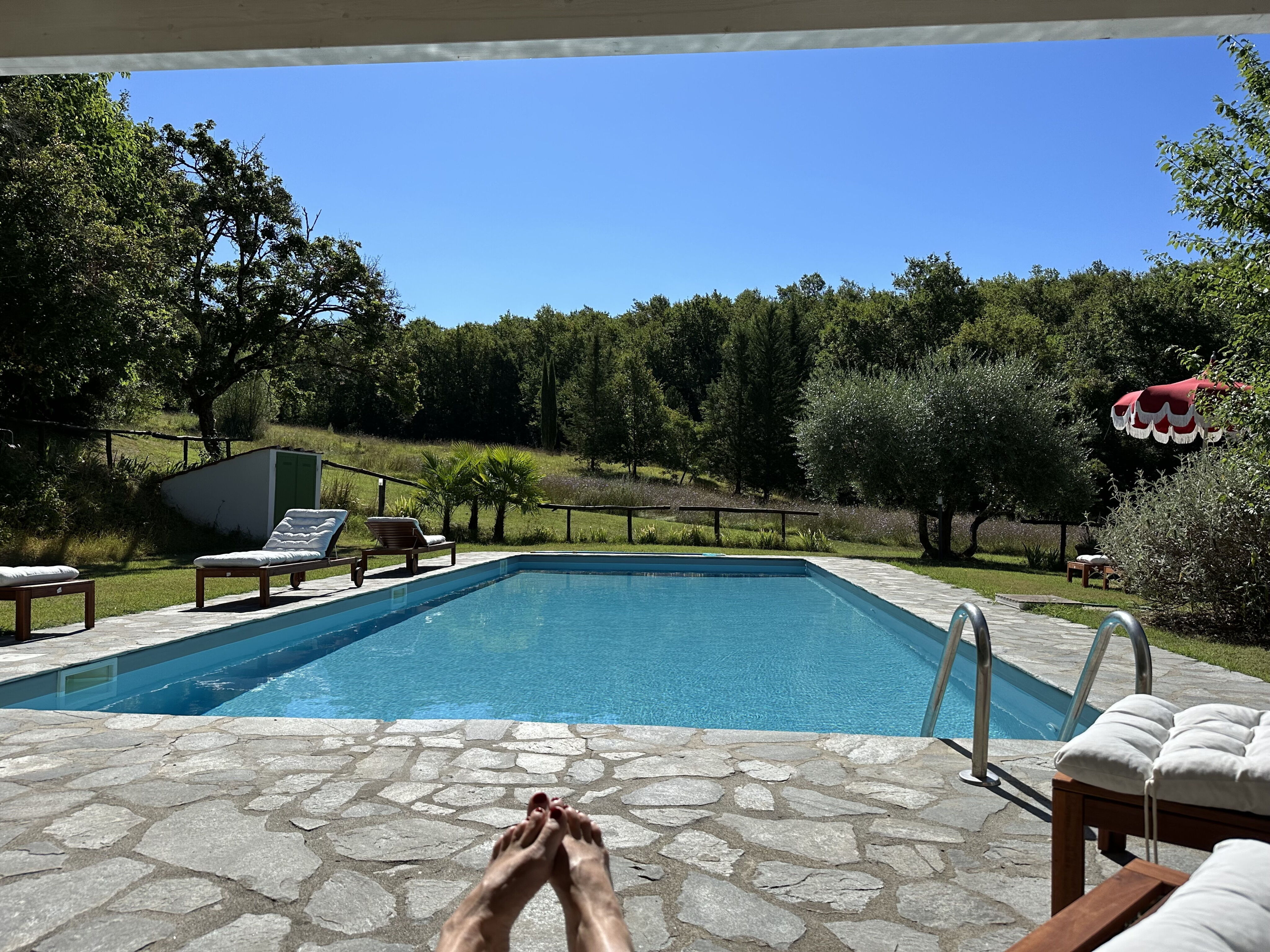 Outside a vast area is entirely private for you. The pool area has a huge park for a large pool (12mt*5mt) with deckchairs and a shower. Two marquees and a wooden pagoda if you want to chill in the shade, eat a snack or drink some wine!