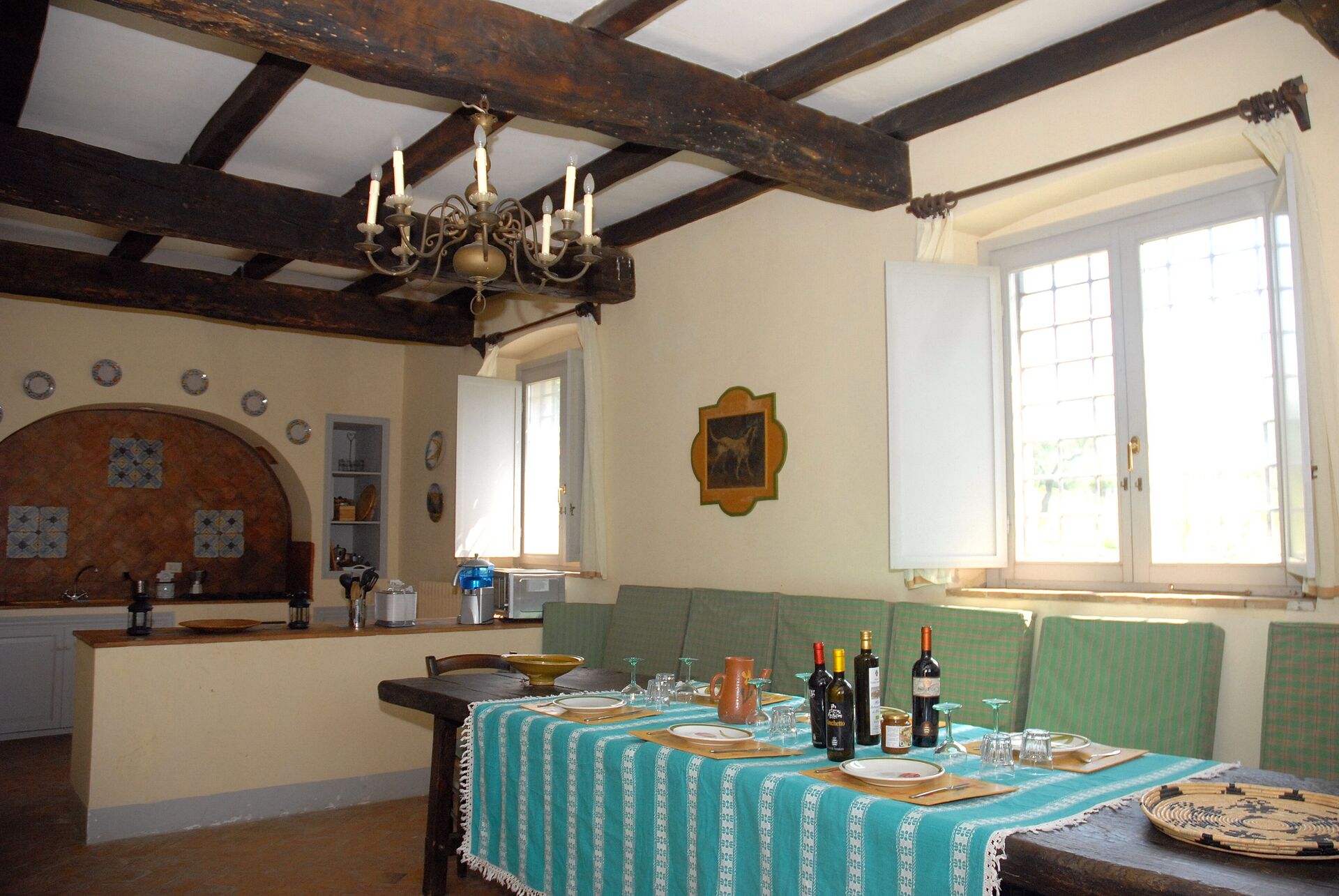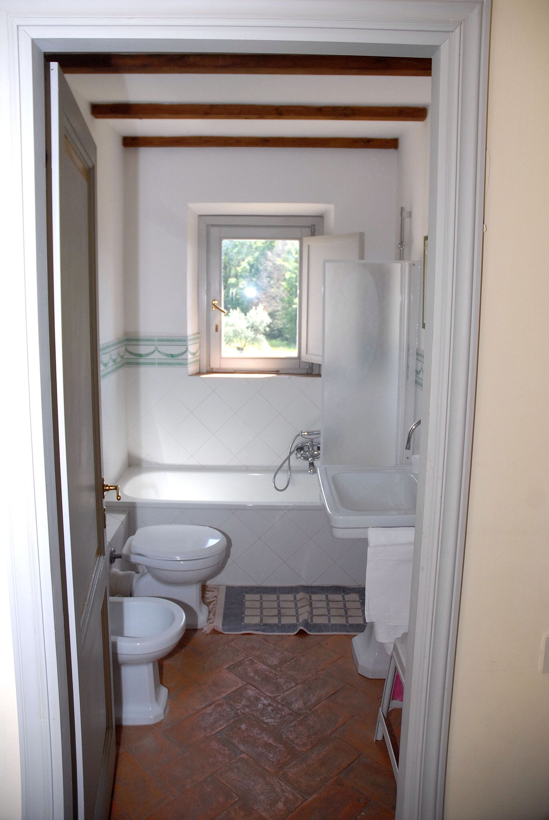 Outside there is a beautiful mt 6x12 swimming pool, with a lovely vista on the hills and on the Castle of Montoro. There is a wood oven with a portico and a covered parking for one car. A cellar with wood for the fire places is at disposal of the clients.