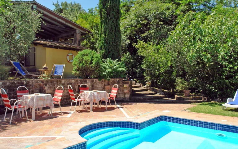 Los espacios exteriores de Podere Rasenna están cuidadosamente diseñados para aprovechar al máximo la ubicación panorámica de la propiedad en la ladera. El jardín privado es expansivo y está bellamente mantenido, con una combinación de un césped bien cuidado y un jardín de vida silvestre más natural que refleja la auténtica campiña toscana que rodea la finca. En el corazón del área verde, la piscina con dimensiones de 5 x 12 metros y una profundidad de 120 a 150 cm, abierta estacionalmente del 19 de abril al 04 de octubre, se complementa con una terraza dedicada para tomar el sol donde los huéspedes pueden relajarse y disfrutar del calor del sol toscano. Una ducha exterior y un vestuario con WC están convenientemente ubicados adyacentes al área de la piscina, y se ponen a disposición toallas de baño para los huéspedes. Una pérgola proporciona un refugio sombreado dentro del jardín, mientras que una amplia terraza amueblada ofrece un escenario ideal para cenas al aire libre, permitiendo a los huéspedes saborear comidas en el aire fresco del campo. Mobiliario de jardín y una barbacoa completan las comodidades exteriores, haciendo que el exterior de la propiedad sea perfectamente adecuado para tardes de ocio y veladas agradables bajo el cielo toscano.