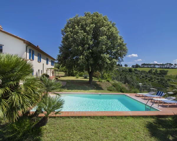 La propiedad cuenta con un pórtico tradicional que proporciona un área sombreada y característica ideal para comer al aire libre, descansar o disfrutar de las vistas panorámicas que se extienden sobre las colinas toscanas hacia el mar. La piscina de temporada mide 5 x 8 metros con una profundidad que varía entre 50 y 200 cm, y está perfectamente posicionada para aprovechar las vistas sobre las colinas y la costa. El área que rodea la piscina invita al relax y disfrute del sol toscano en completa privacidad. Los extensos terrenos abarcan un paisaje variado de bosques, olivares y prados abiertos que ofrecen amplio espacio para paseos tranquilos y conexión genuina con el entorno natural. El jardín privado completamente vallado proporciona un espacio exterior seguro e íntimo.