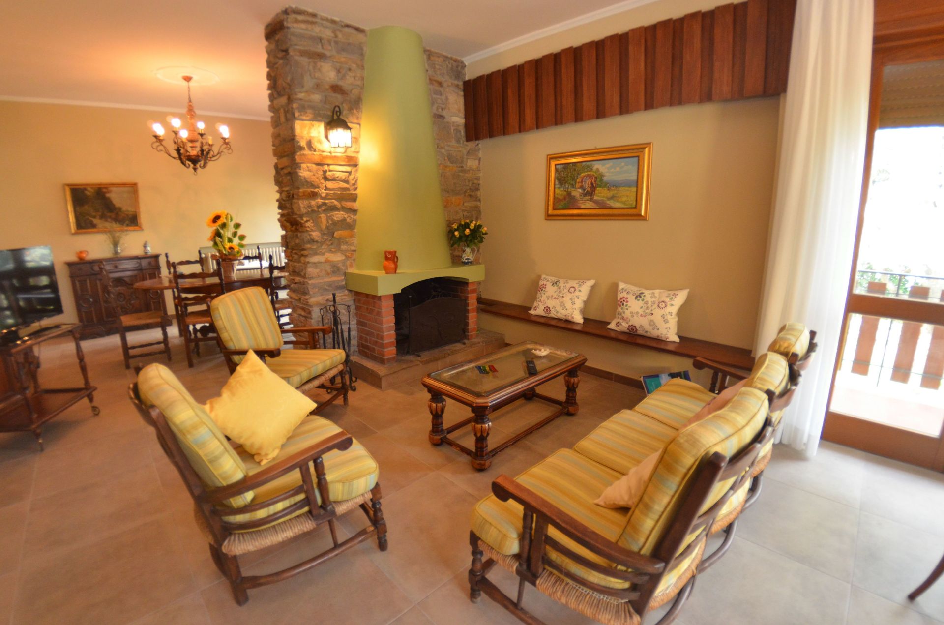 Salón: sofa, dos sillones, mesa de comedor, televisión, acceso a la terraza.