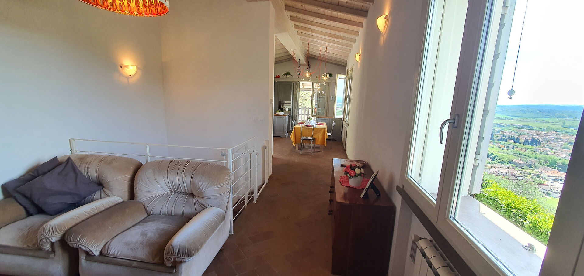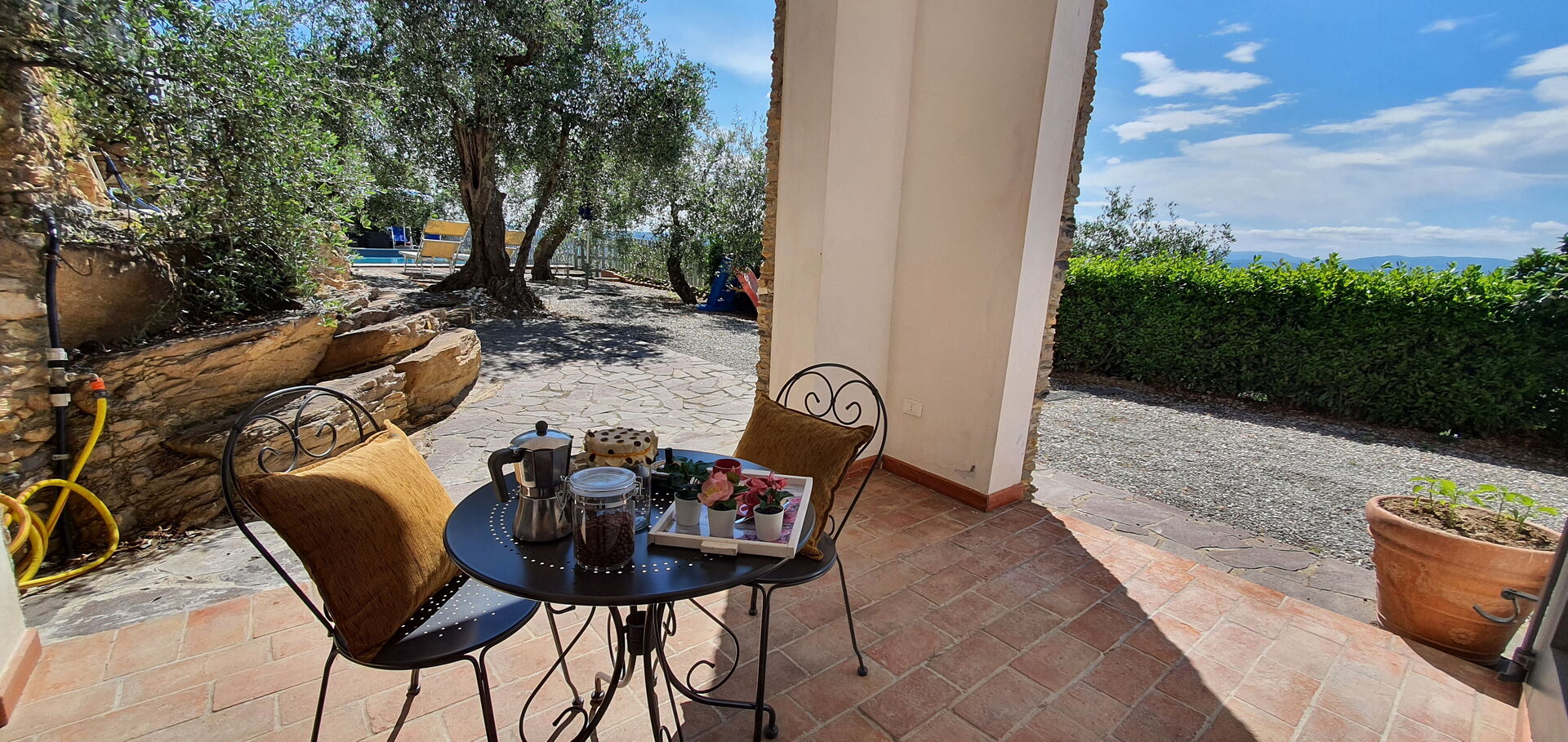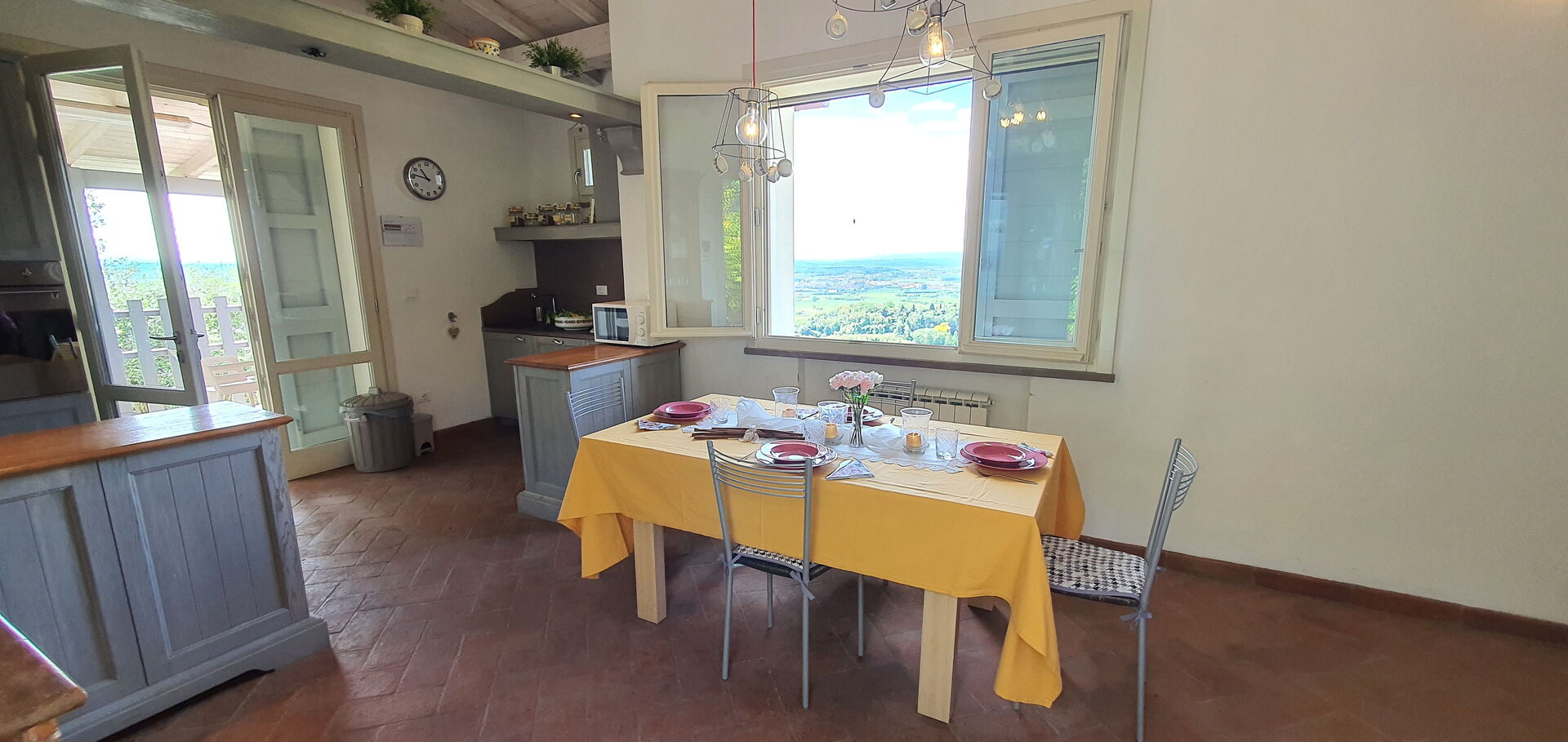 Después de llegar a Podere San Martino encontraras una hermosa propiedad limpia y acogedora con vista sobre las colinas perfecta para unas vacaciones relajantes en Toscana. Después un día pasado a visitar lugares turísticos, disfrute de una buena copa de vino con sus amigos y su familia al lado de la piscina - lo mejor para descansar después de un largo día. Afuera encontrará parrilla y parque infantil. Hay una cocina incluso máquina de café, microondas, tostador, estufa y nevera, así como , muchas vajillas y cubiertos para hasta seis personas. Si prefiere comer afuera 'al fresco', hay la veranda, un espacio bien equipado donde puede disfrutar el buen clima comiendo afuera.
