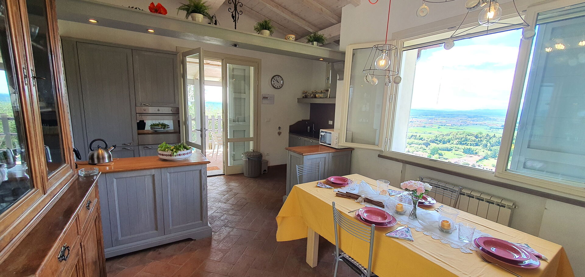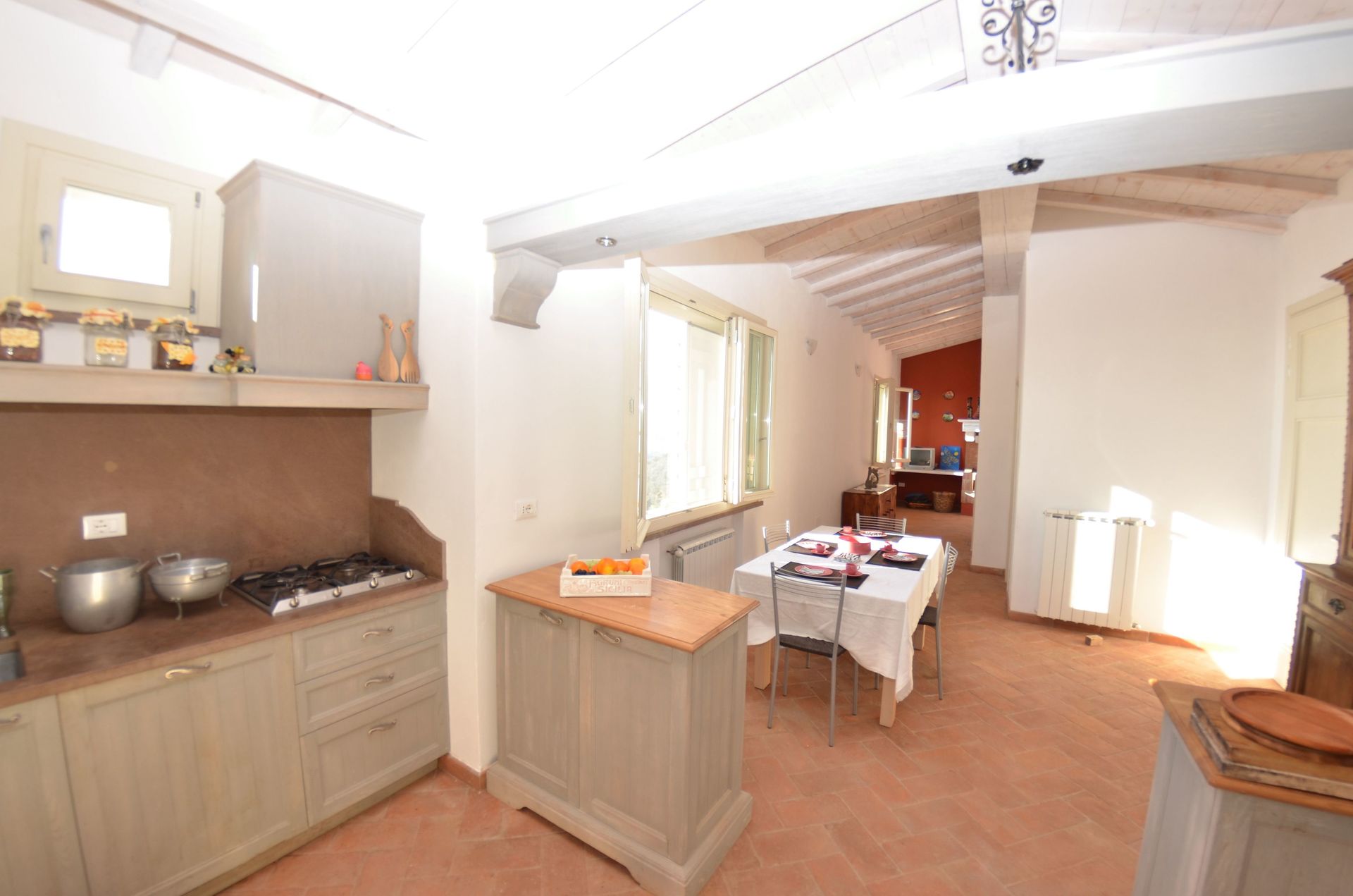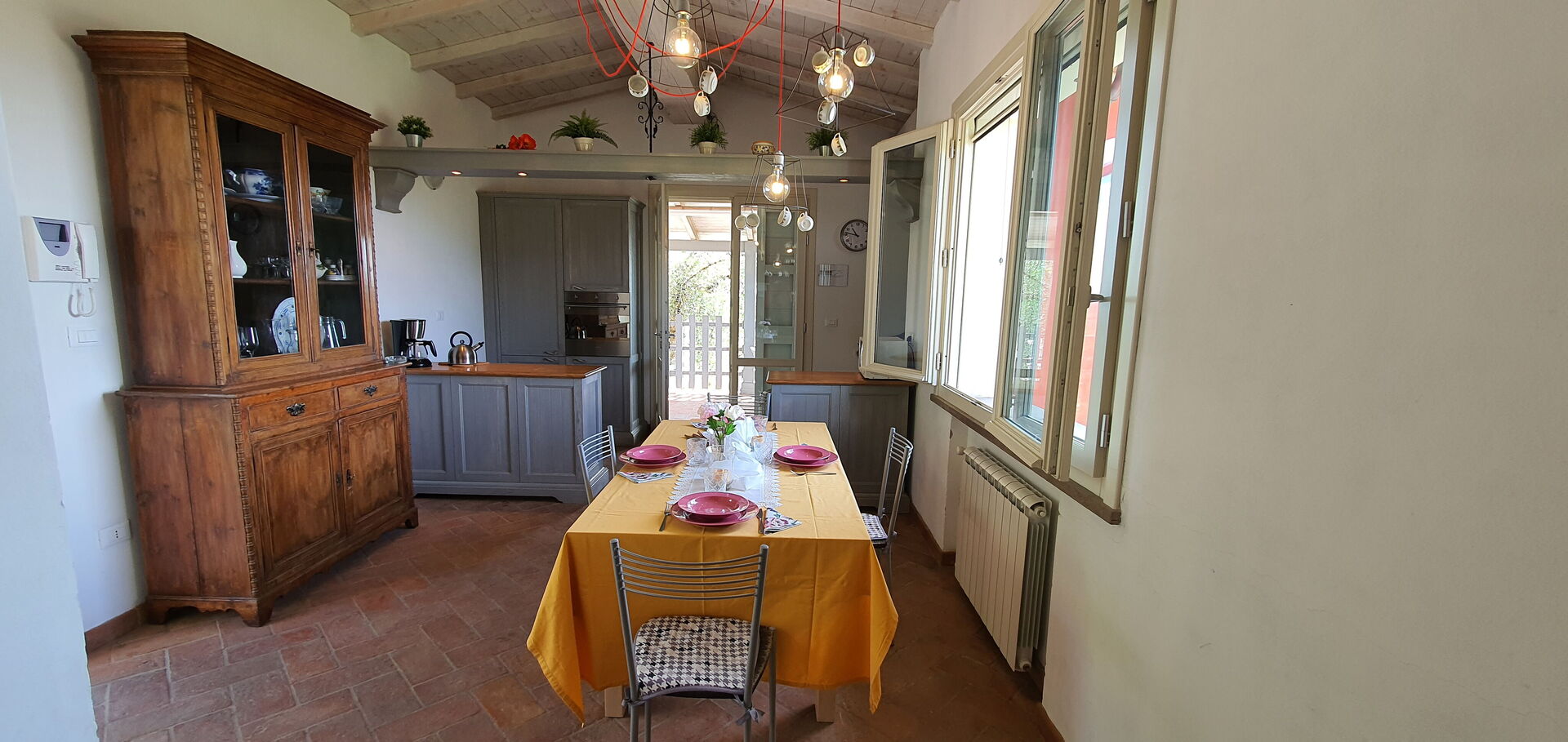 Cocina: mesa de comedor (gente: 6), lavavajillas, frigorífico, congelador, cocina de gas, horno, acceso al jardín, acceso a la terraza.