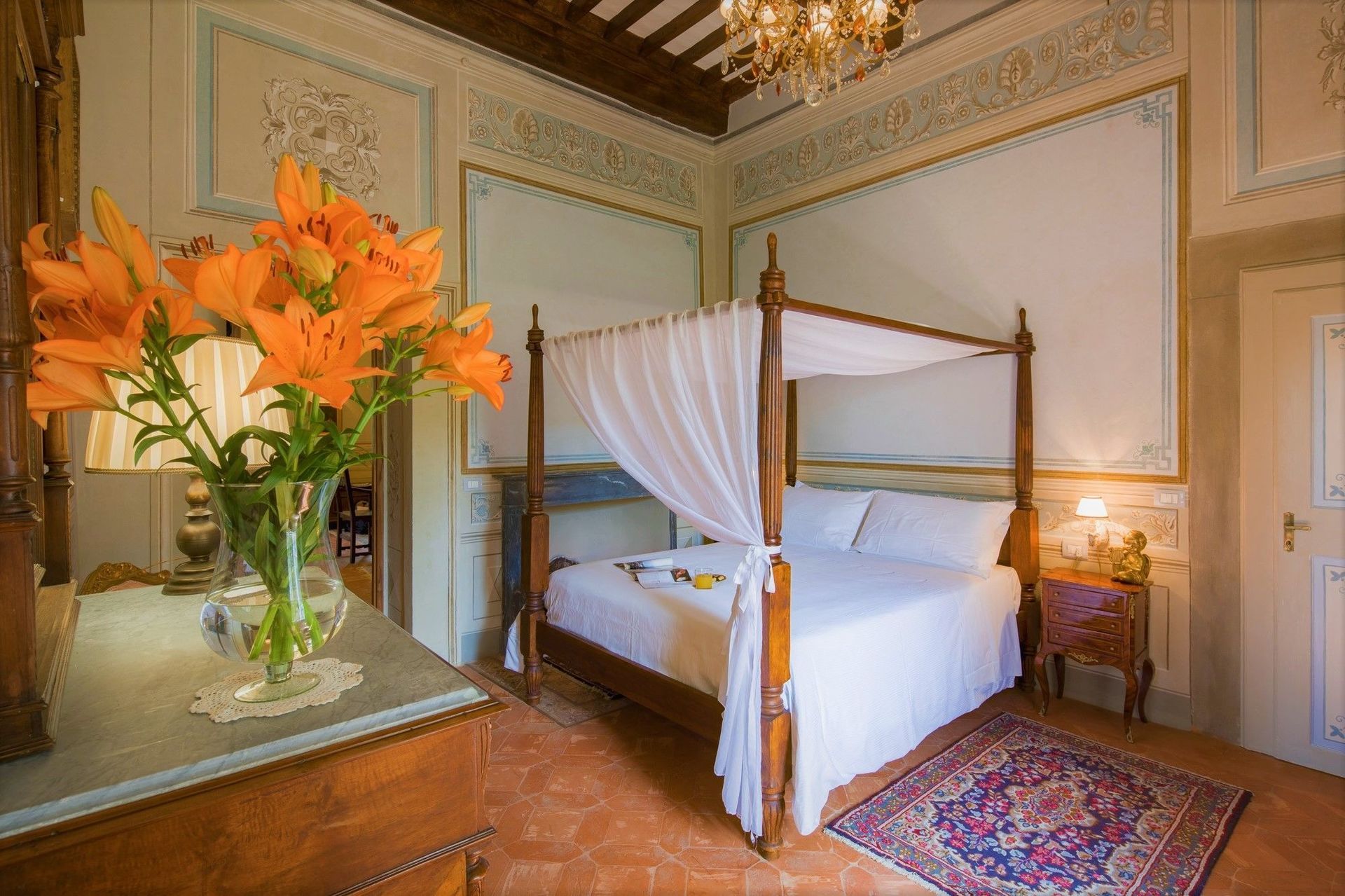 Habitación con baño 4: cama de matrimonio (ancho: 165m, longitud: 200m), WIFI internet, internet, aire acondicionado, mosquitero, tv vía satélite, televisión, sofa, dos sillones, chimenea, lavabo, baño, bidé, ducha, secador.