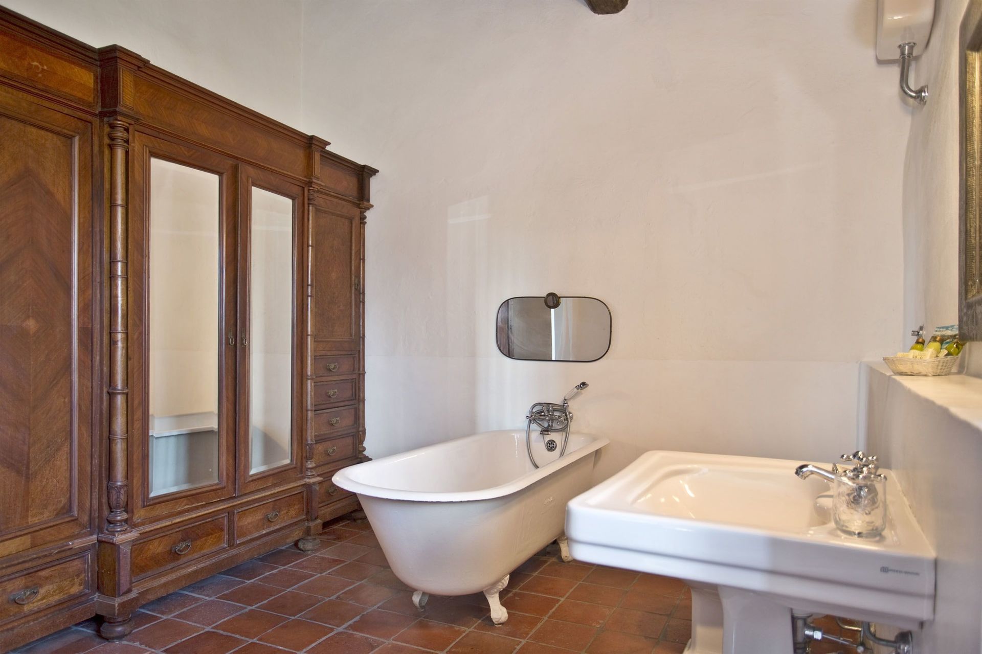 Habitación con baño: cama doble, lavabo, baño, bidé, bañera, secador, acceso al jardín.