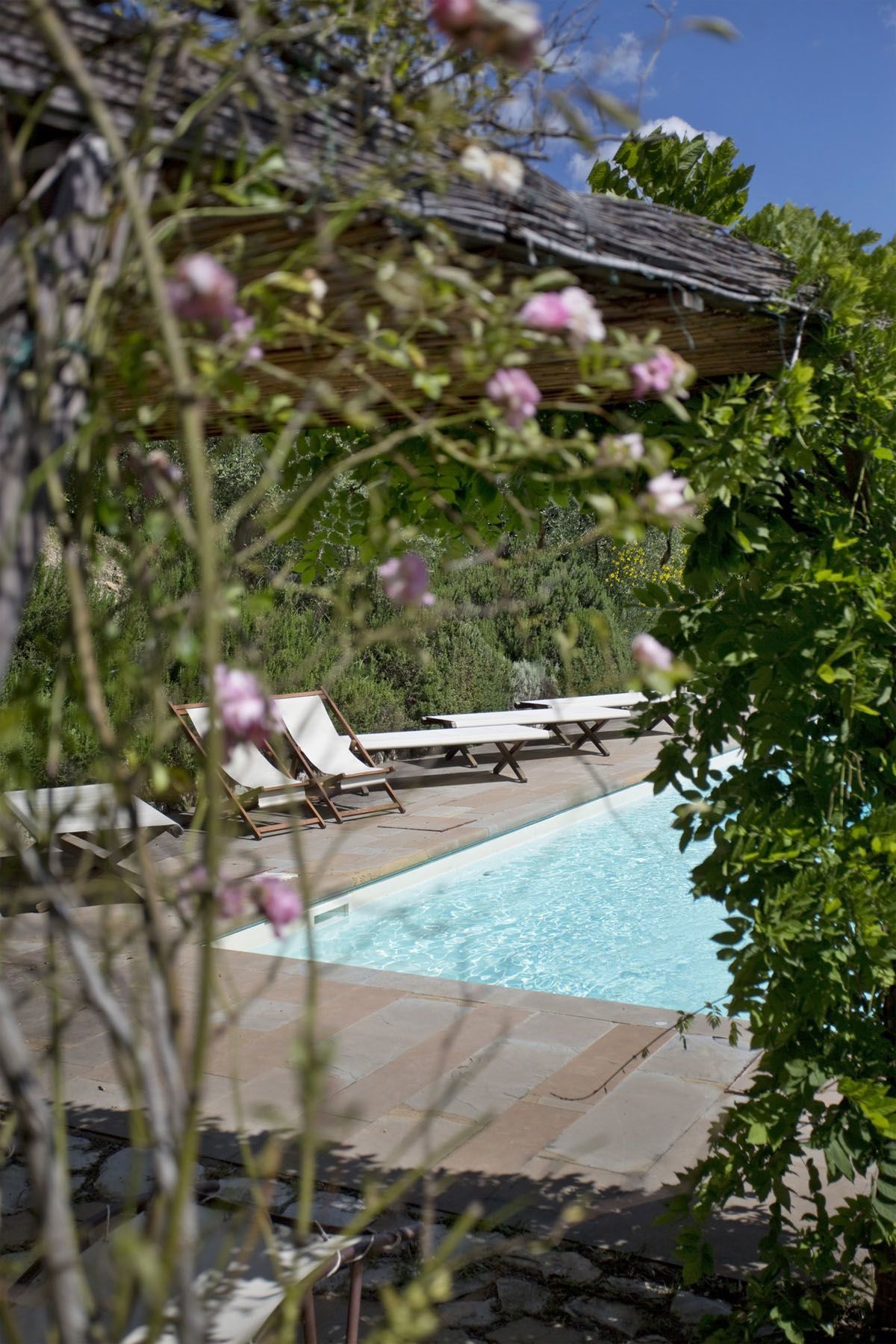 La piscina es en la parte más alta del jardín, donde los clientes también encuentran un vestuario y un baño con ducha.