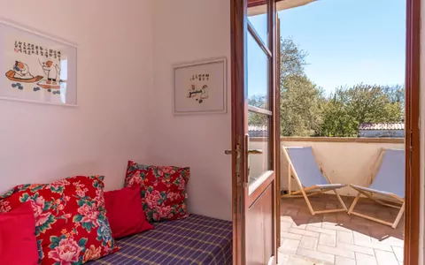 La villa "Querceto" ocupa 60 m² distribuidos en 2 plantas y aloja un máximo de 4 huéspedes en 2 dormitorios y 1 baño. La planta baja alberga el primer dormitorio con cama francesa de 160 cm, cocina completamente equipada con mesa de comedor, horno, fogones de gas con 4 quemadores, congelador y cafetera eléctrica, así como zona de estar con chimenea de hogar abierto que proporciona calidez al espacio. Una puerta de salida directa comunica con la terraza parcialmente cubierta, apta para comer al aire libre. El baño de esta planta está equipado con ducha, bidé e inodoro. La primera planta aloja el segundo dormitorio con 1 cama y 1 sofá cama, con acceso a un balcón privado desde el que se contemplan vistas panorámicas de la campiña circundante.