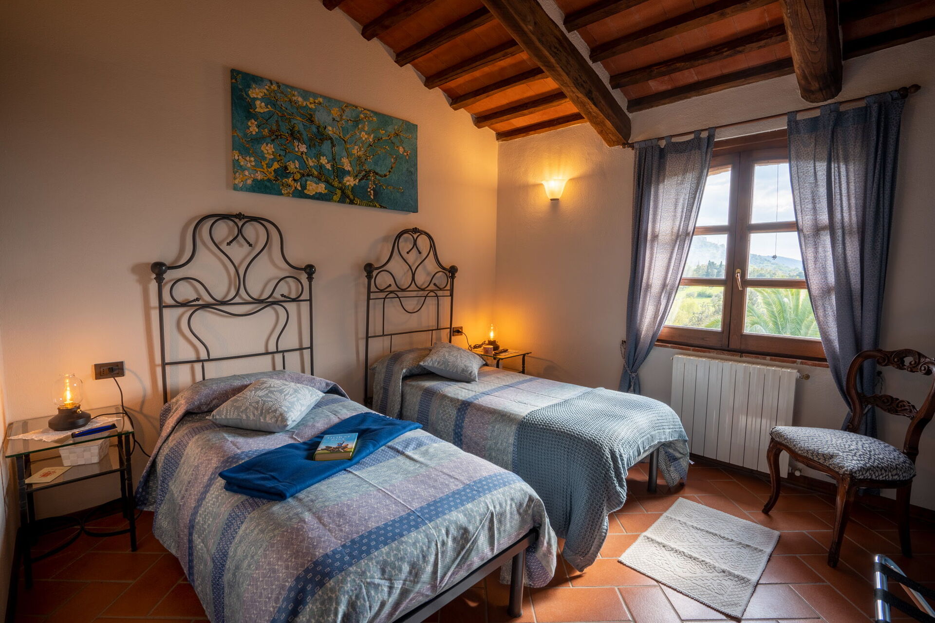 Habitación (14 m2): dos camas individuales, WIFI internet, aire acondicionado, mosquitero, tv vía satélite, escritorio.