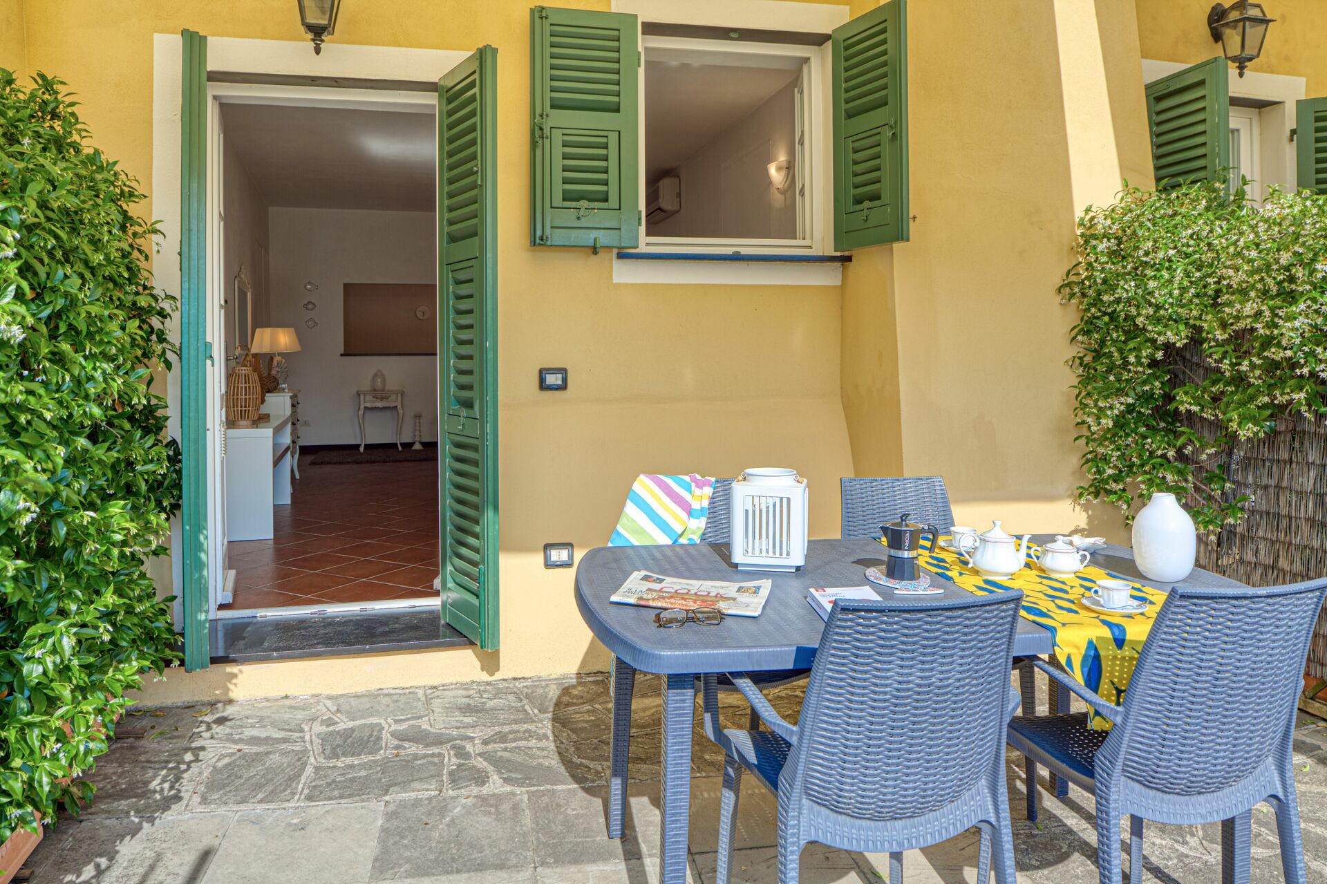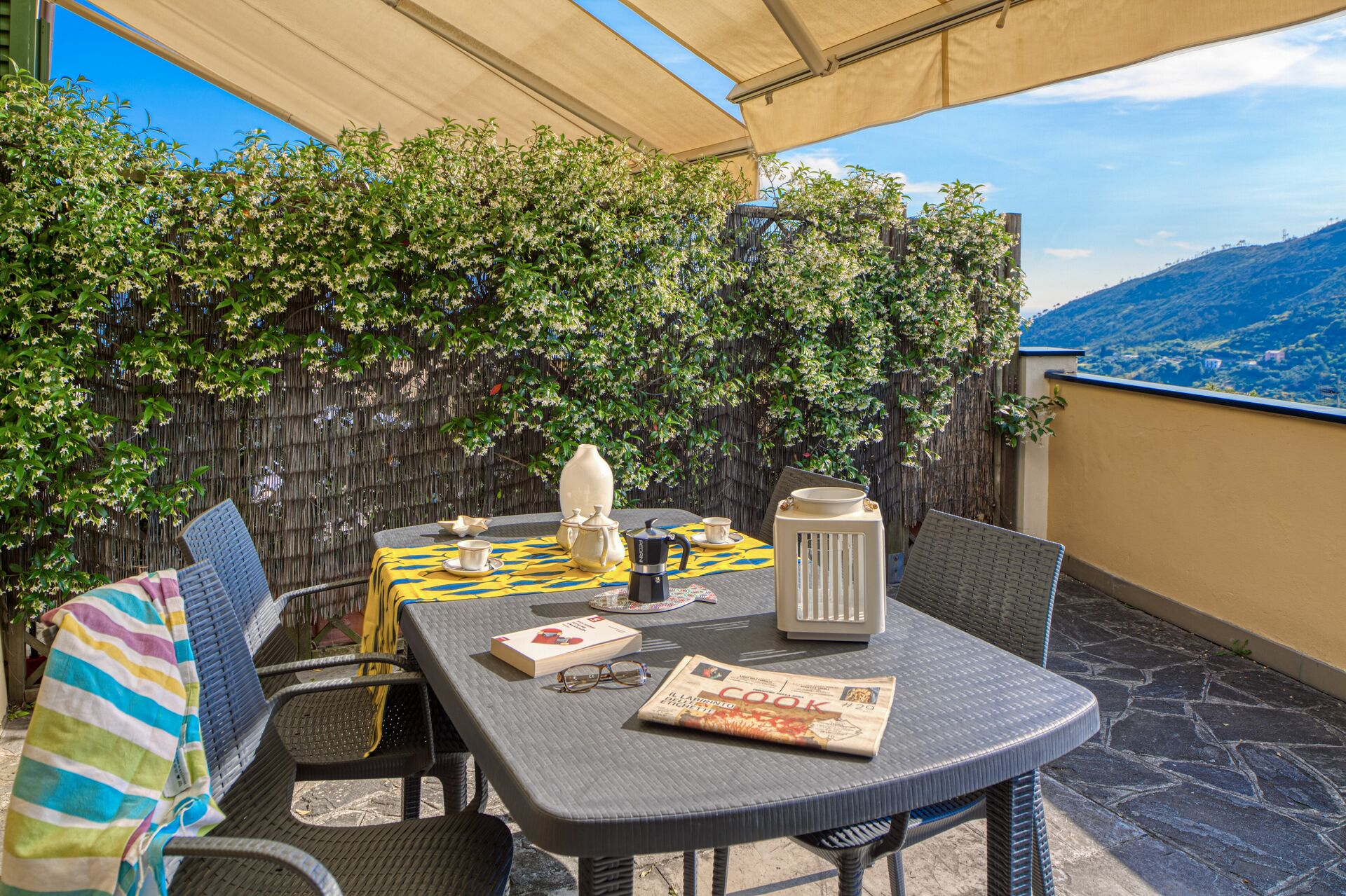 Terraza con toldo motorizado, mesa y sillas, con una vista espectacular sobre el golfo de Levanto.