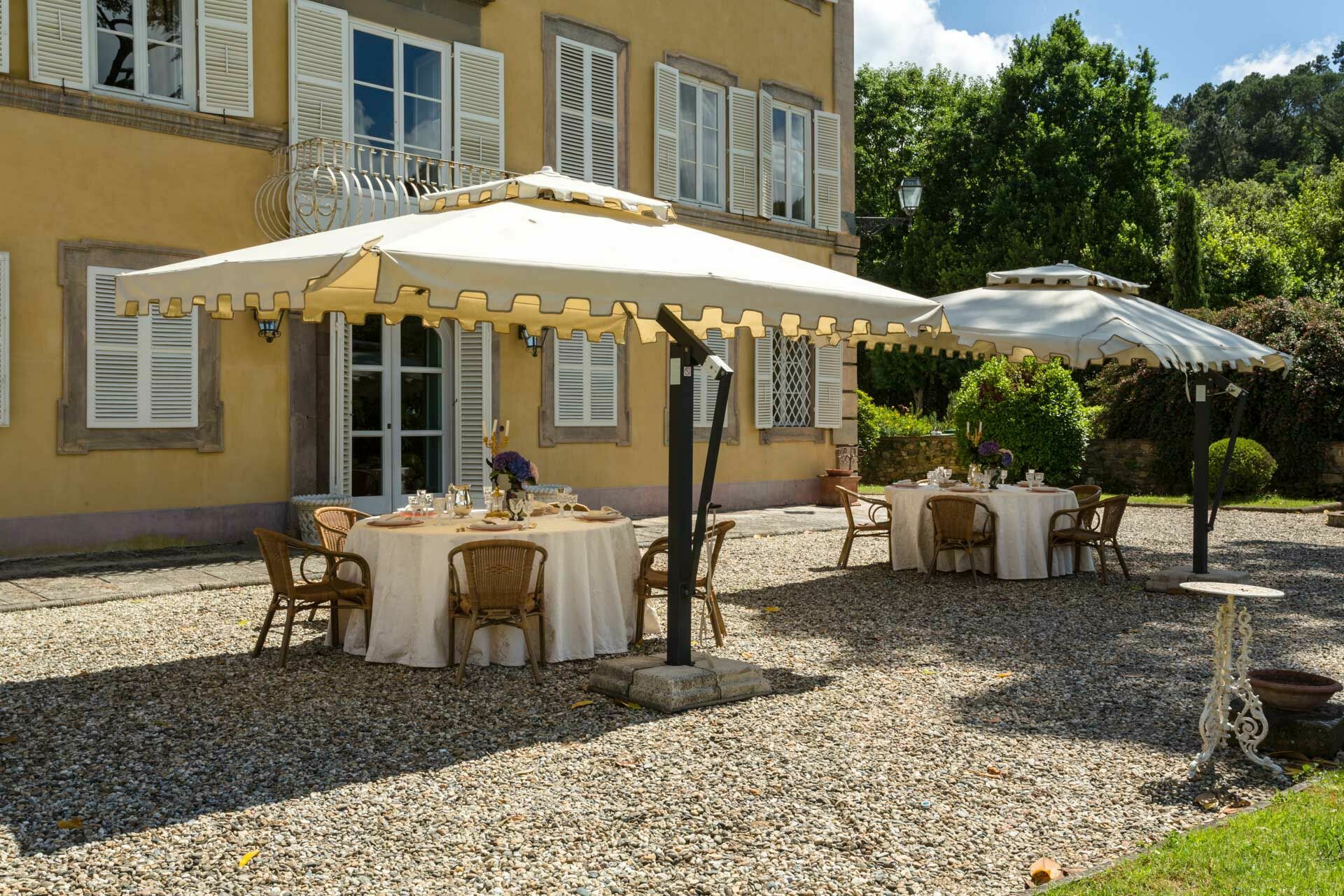 impressive alfresco dining areas: one in front of the Villa, its majestic facade and lovely private lake; another