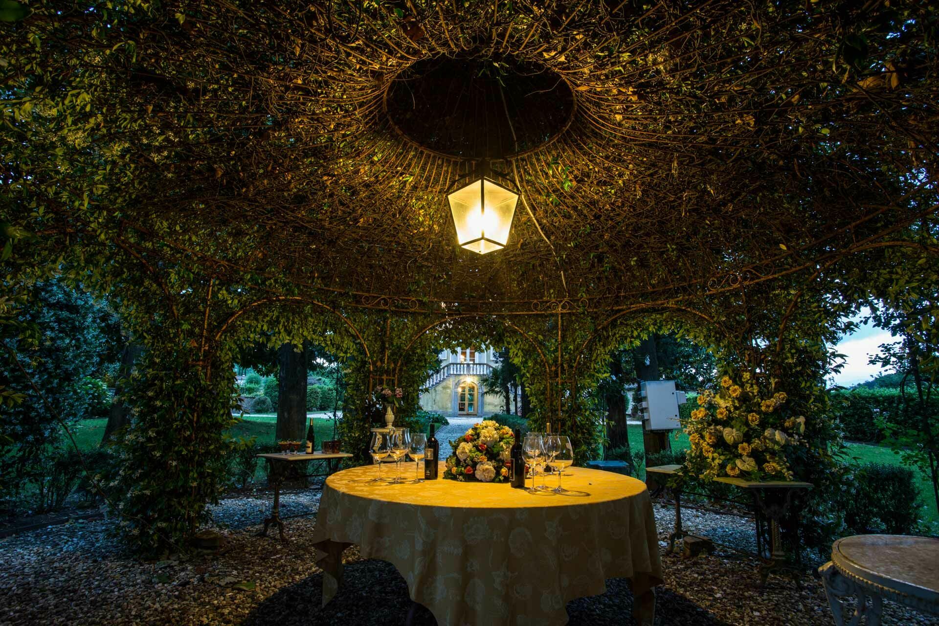 in the Italian garden in the backyard overlooking the surrounding area. The jasmine gazebo with a table and