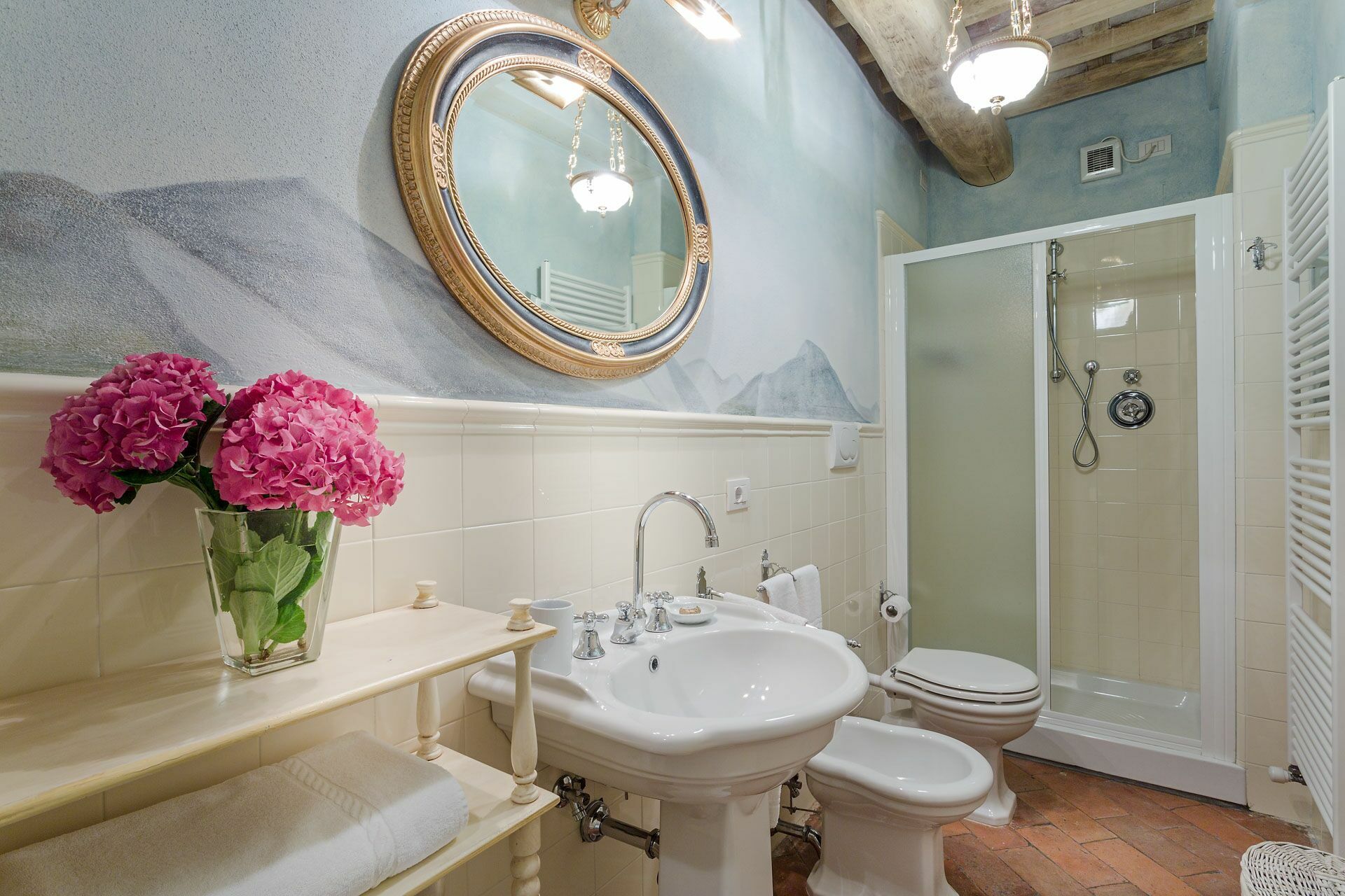 Habitación con baño 4: dos camas individuales (ancho: 0.9m, longitud: 2m), aire acondicionado, seguridad, lavabo, baño, bidé, ducha.