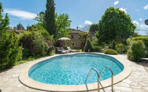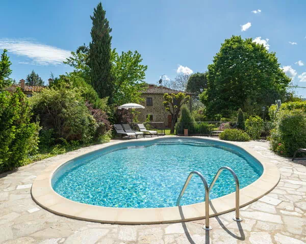 Cada apartamento dispone de un jardín privado vallado de 400 m2, para un total de 800 m2 de jardín privado. La piscina mide 11 x 5 metros con una profundidad que varía entre 100 y 175 cm; está equipada con un sistema de limpieza por electrólisis salina y una ducha de agua caliente exterior. El área de la piscina cuenta con mobiliario de jardín confortable. Desde este espacio se pueden contemplar las vistas de los campos de girasoles típicos del paisaje toscano y, al atardecer, el castillo de Gargonza en el horizonte. Las instalaciones recreativas incluyen una mesa de ping-pong y una pista de petanca.