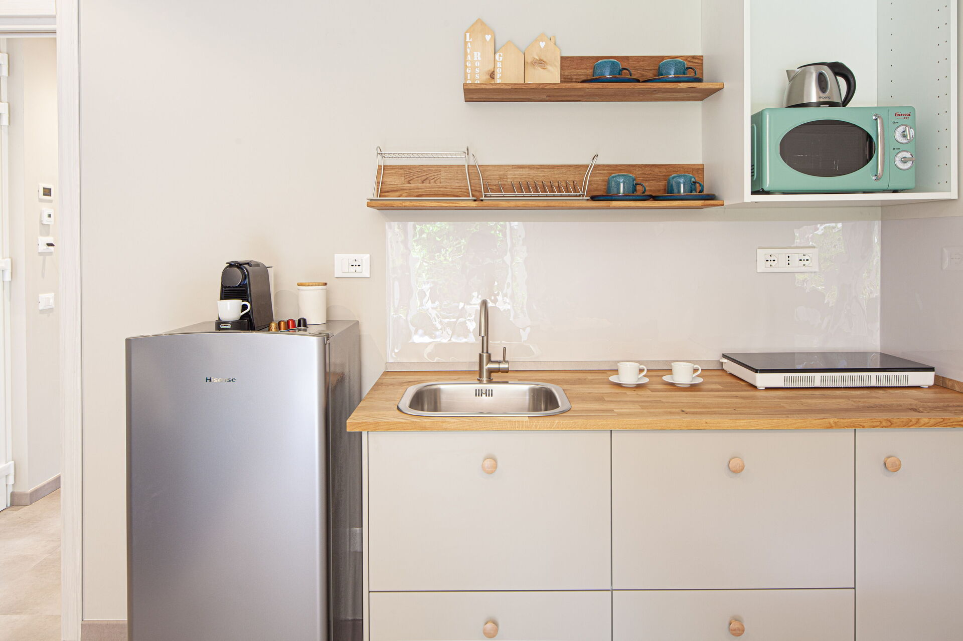 - Uma sala com kitchenette equipada com placa de indução, forno combinado (microondas + grill), lava-louça, frigorífico com congelador, máquina de café Nespresso, máquina de café americana, italiana Moka, chaleira elétrica. Mesa de jantar com 4 cadeiras.
