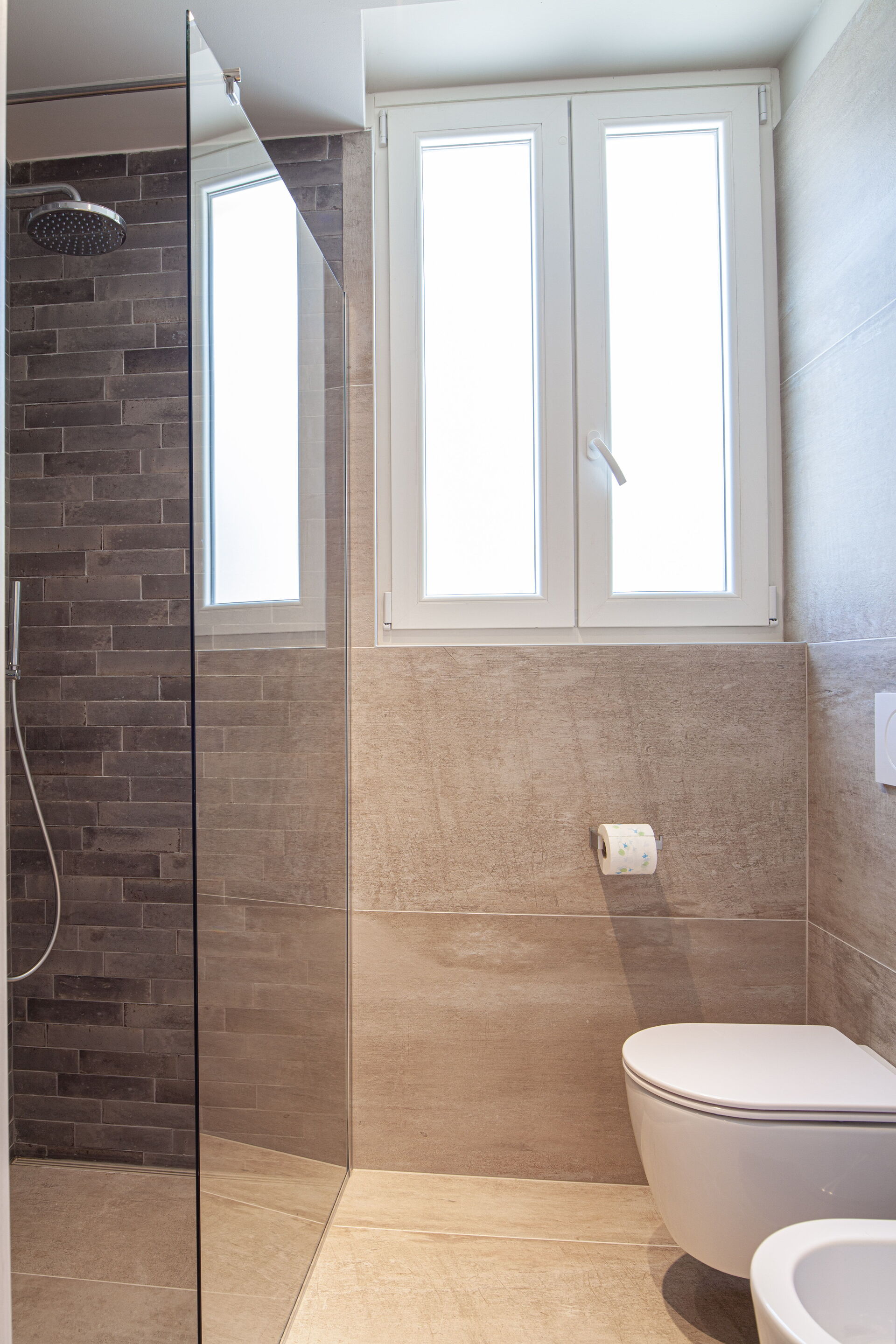 - Banheiro com pia, chuveiro, vaso sanitário e bidê.