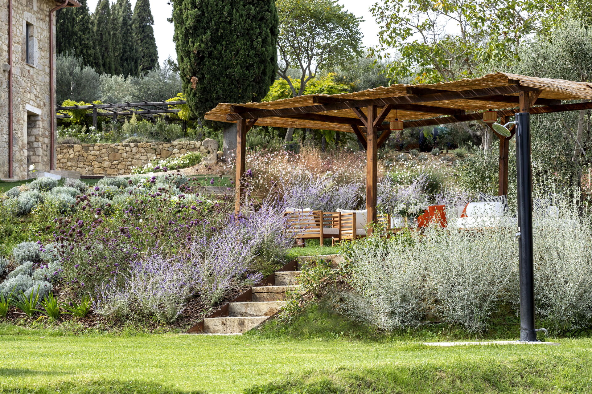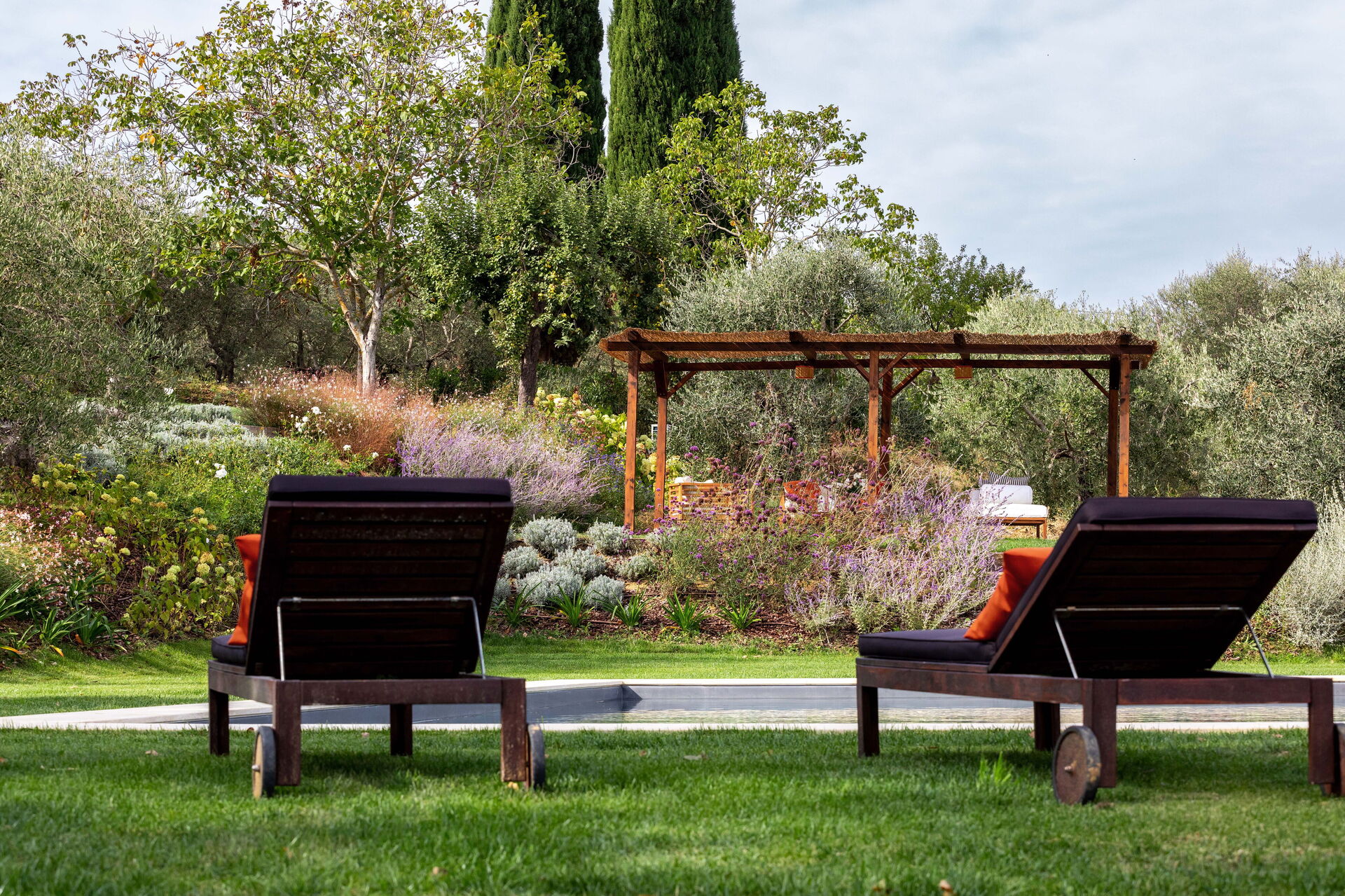 Jardín: piscina (privado/a, ancho: 6m, longitud: 12m, profundidad: 1.5m, fuera), barbacoa, comer al aire libre, dos cenadores, mobiliario de terraza, diez tumbonas.