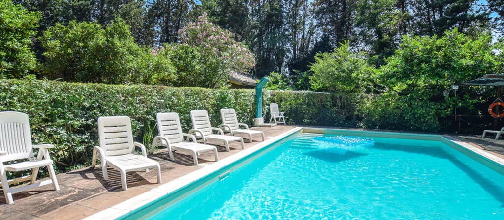 El jardín vallado de 1 hectárea proporciona privacidad completa y una verdadera experiencia de vida en el campo abierto. La piscina mide 5 x 10 metros con una profundidad de 140 cm y está disponible del 15 de mayo al 15 de octubre; cuenta con una ducha exterior. El mobiliario de jardín está distribuido en las áreas exteriores, creando espacios confortables para tomar el sol, leer o contemplar las vistas de los viñedos y campos. La propiedad dispone de una barbacoa y una casa de barbacoa dedicada para cenas al aire libre. Un parque infantil se encuentra dentro del jardín para el disfrute de los huéspedes más jóvenes.