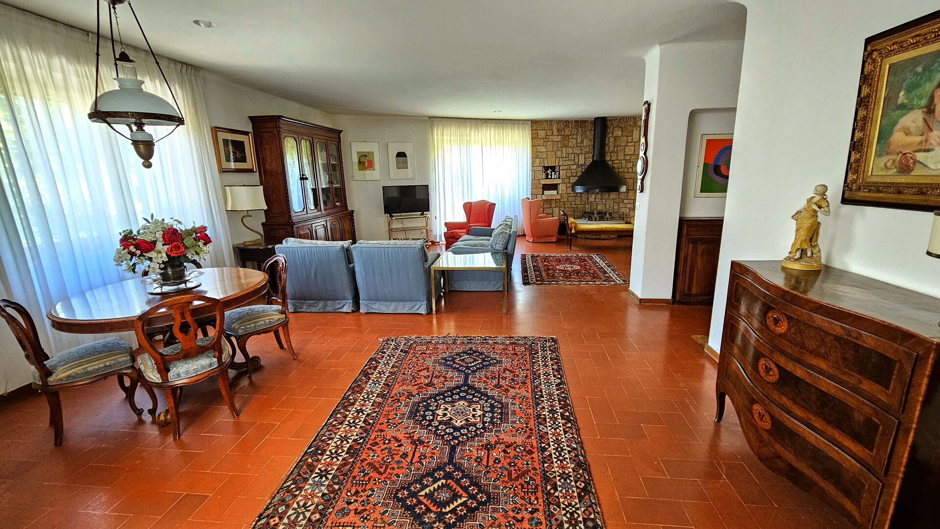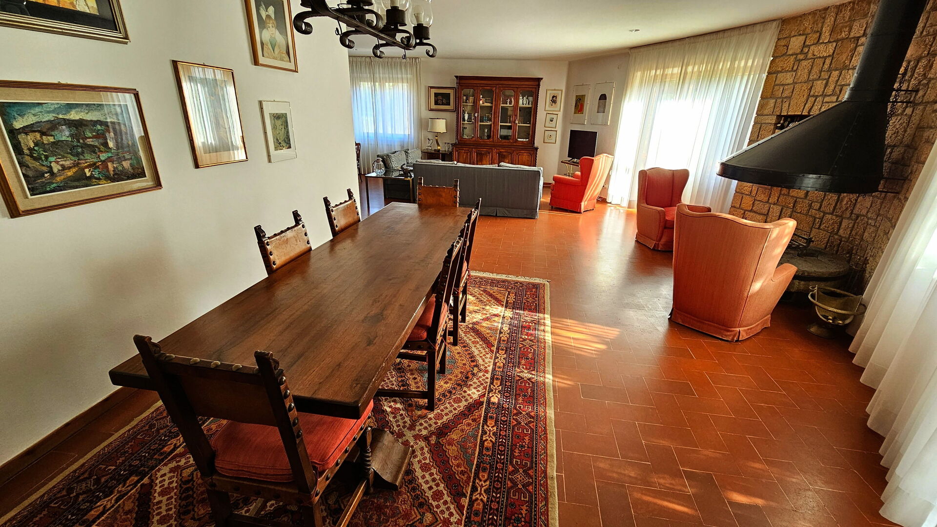 Salón (75 m2): sofa, sillón, chimenea, mesa de comedor, WIFI internet, televisión, estéreo hifi, acceso al jardín, acceso al porche.
