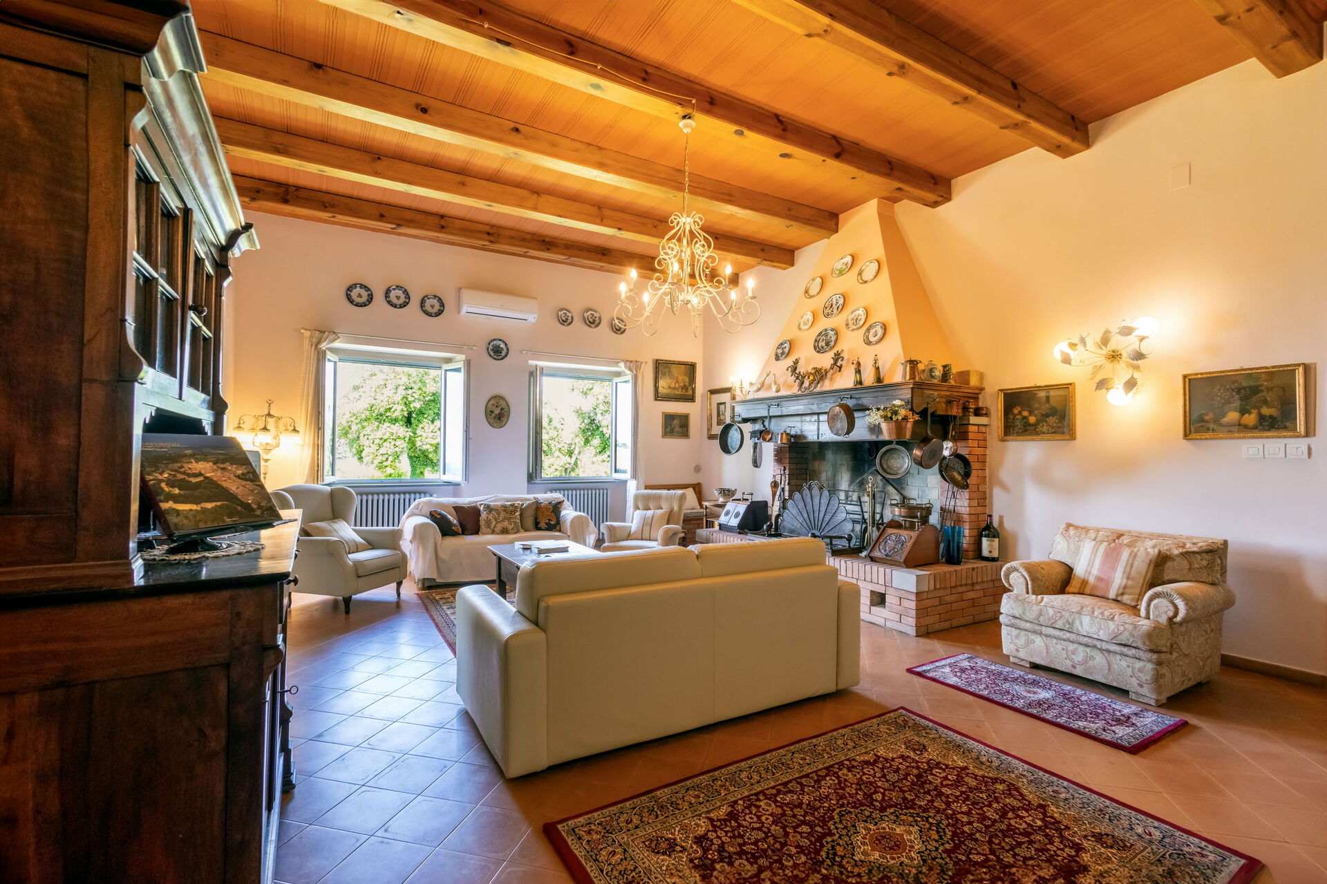 Salón (44 m2): tres sofas (gente: 12), tres sillones, chimenea, sofá cama de matrimonio (ancho: 1.6m, longitud: 2m), tres cunas (ancho: 0.8m, longitud: 1m), tres cunas de bebe, WIFI internet, aire acondicionado, tv vía satélite, televisión, mosquitero, detector de humo, detector de co2.