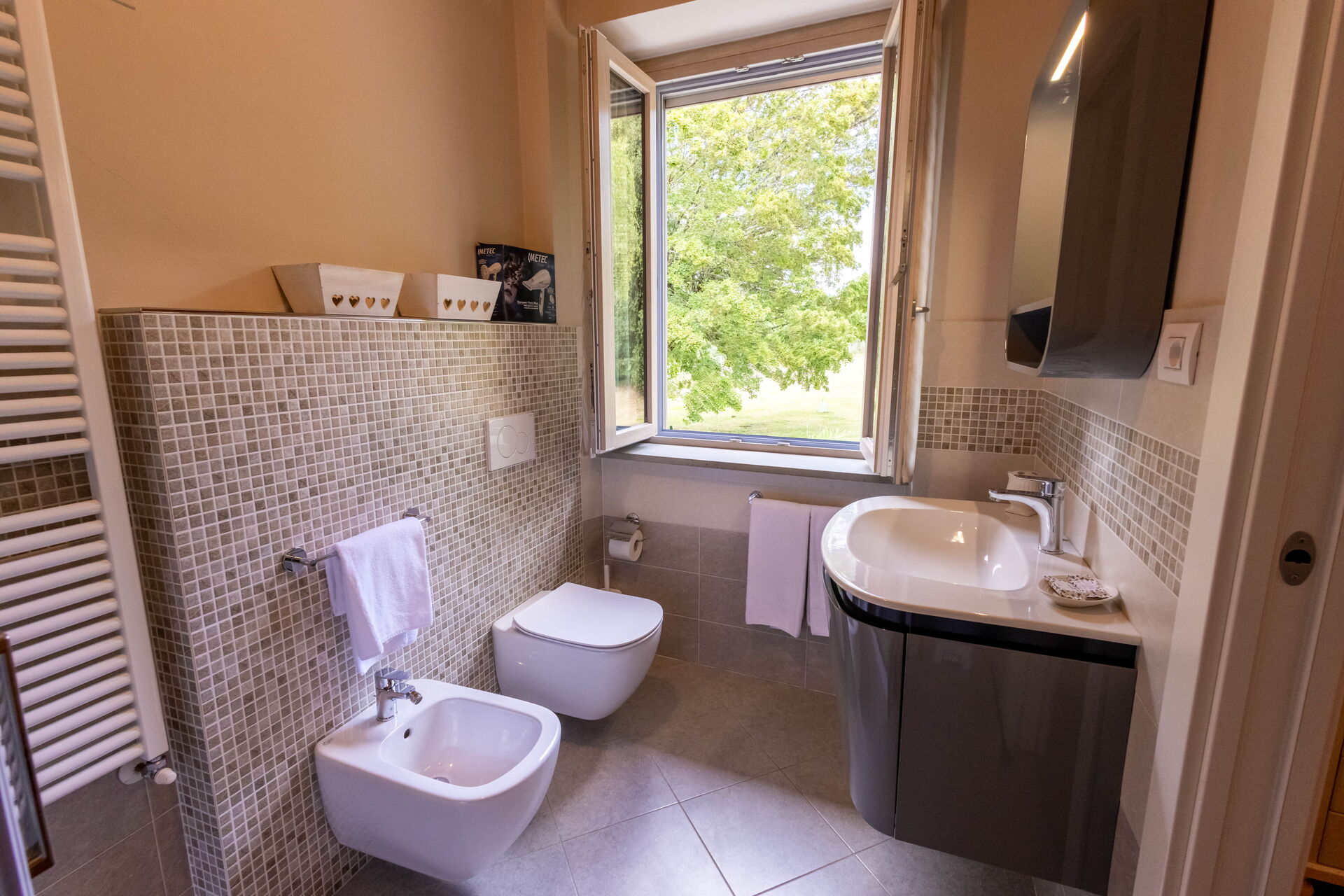 Baño: lavabo, baño, bidé, ducha, secador.