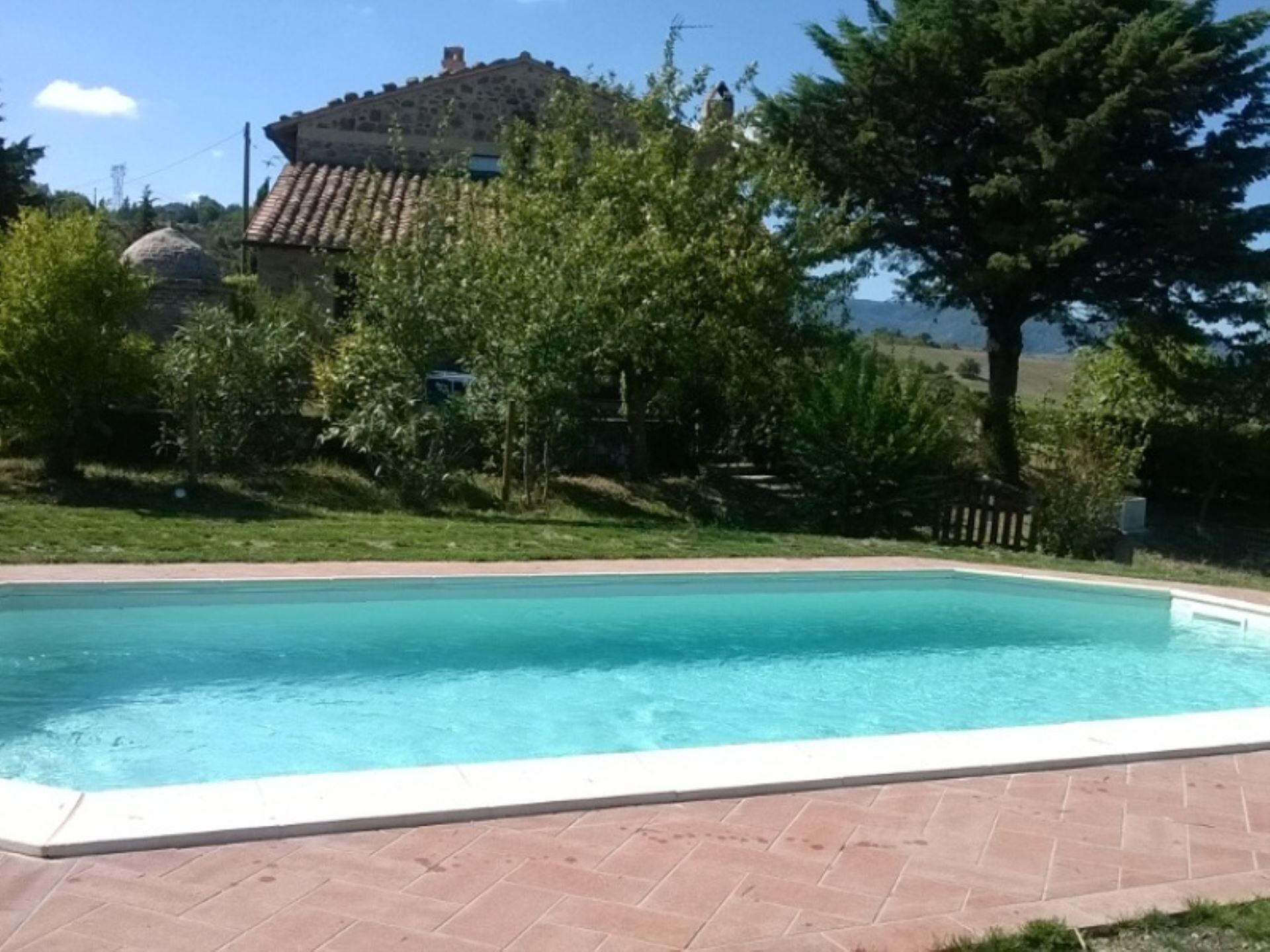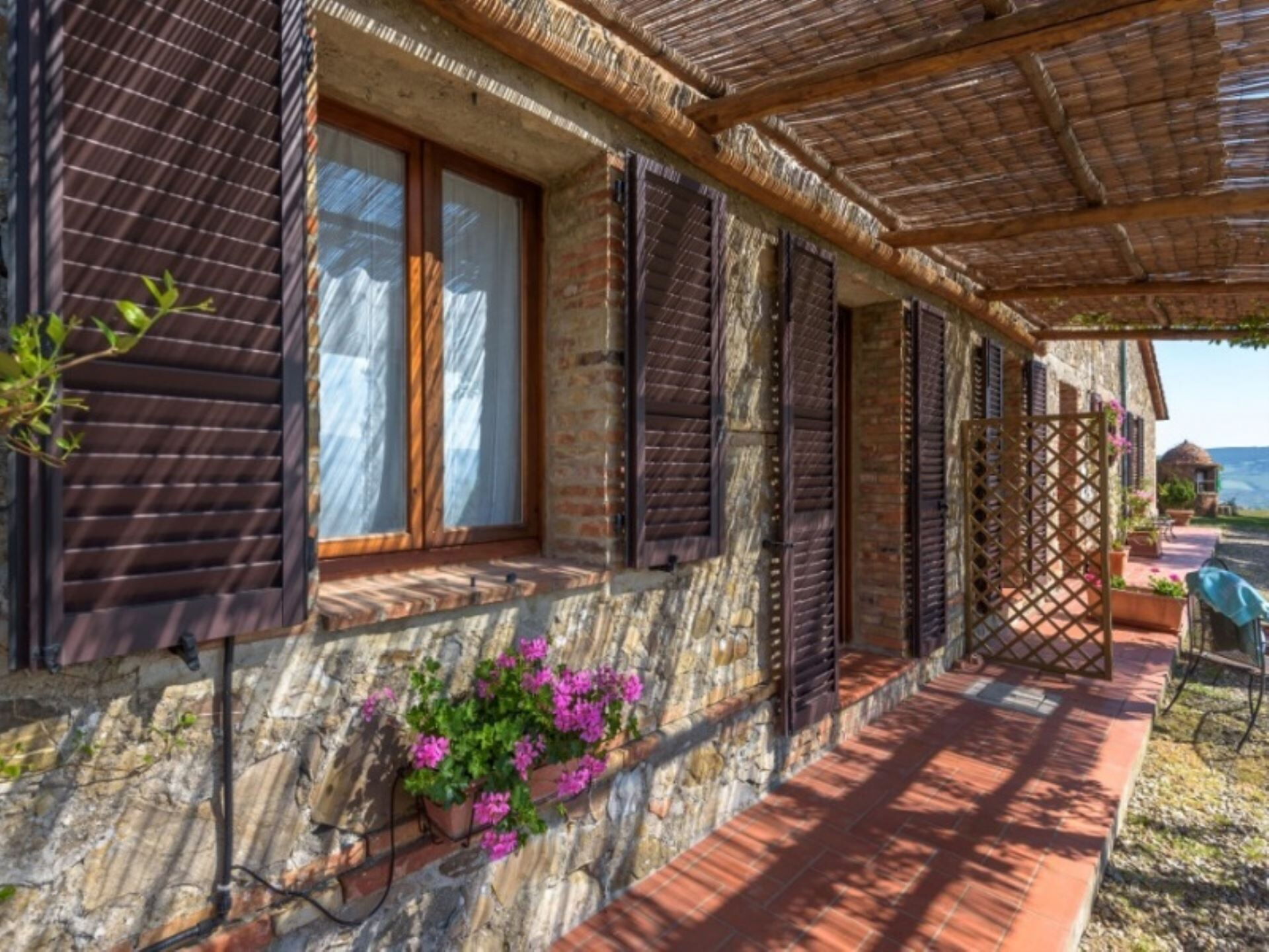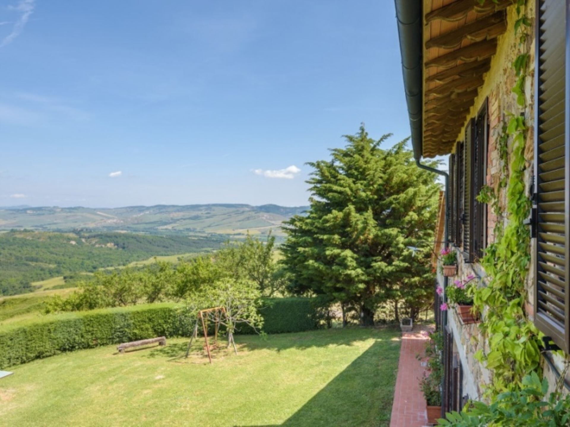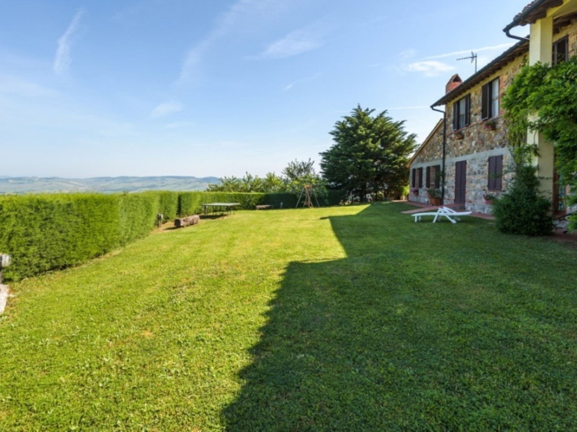Los espacios exteriores de Podere del Mezzadro ofrecen áreas excepcionales para la relajación y el entretenimiento. Disfrutará de una piscina panorámica no climatizada de 8 x 4 metros con una profundidad que varía de 1,20 a 1,40 metros, vallada por seguridad y abierta del 1 de mayo al 31 de octubre. La propiedad cuenta con un amplio jardín que rodea la casa de labranza, proporcionando abundante espacio para actividades al aire libre y ocio. Una encantadora pérgola de jazmín se extiende desde la casa, creando un área sombreada donde podrá cenar al aire libre en cómodas mesas de hierro con sillas. Encontrará mobiliario exterior estratégicamente distribuido por todo el terreno para maximizar su disfrute de las impresionantes vistas. Hay disponible una zona de barbacoa para preparar comidas al aire libre, y los niños disfrutarán del parque infantil dedicado. Los apartamentos de la planta baja se abren directamente a la pérgola de jazmín, mientras que el apartamento Lavanda proporciona acceso a través de una puerta francesa al amplio césped trasero. El apartamento Oleandro da a un pequeño rincón verde y apartado de la finca, ofreciendo privacidad y tranquilidad adicionales.