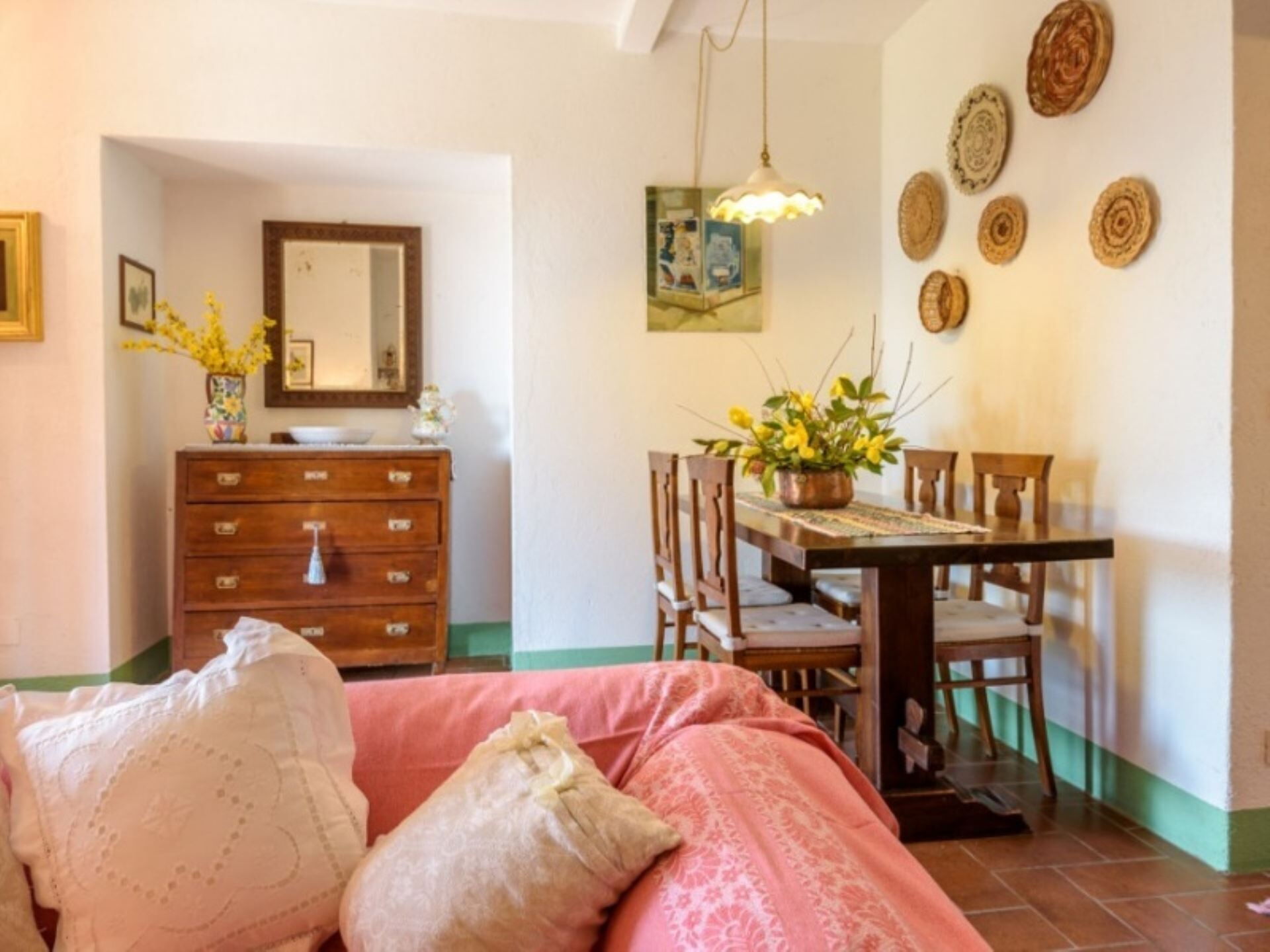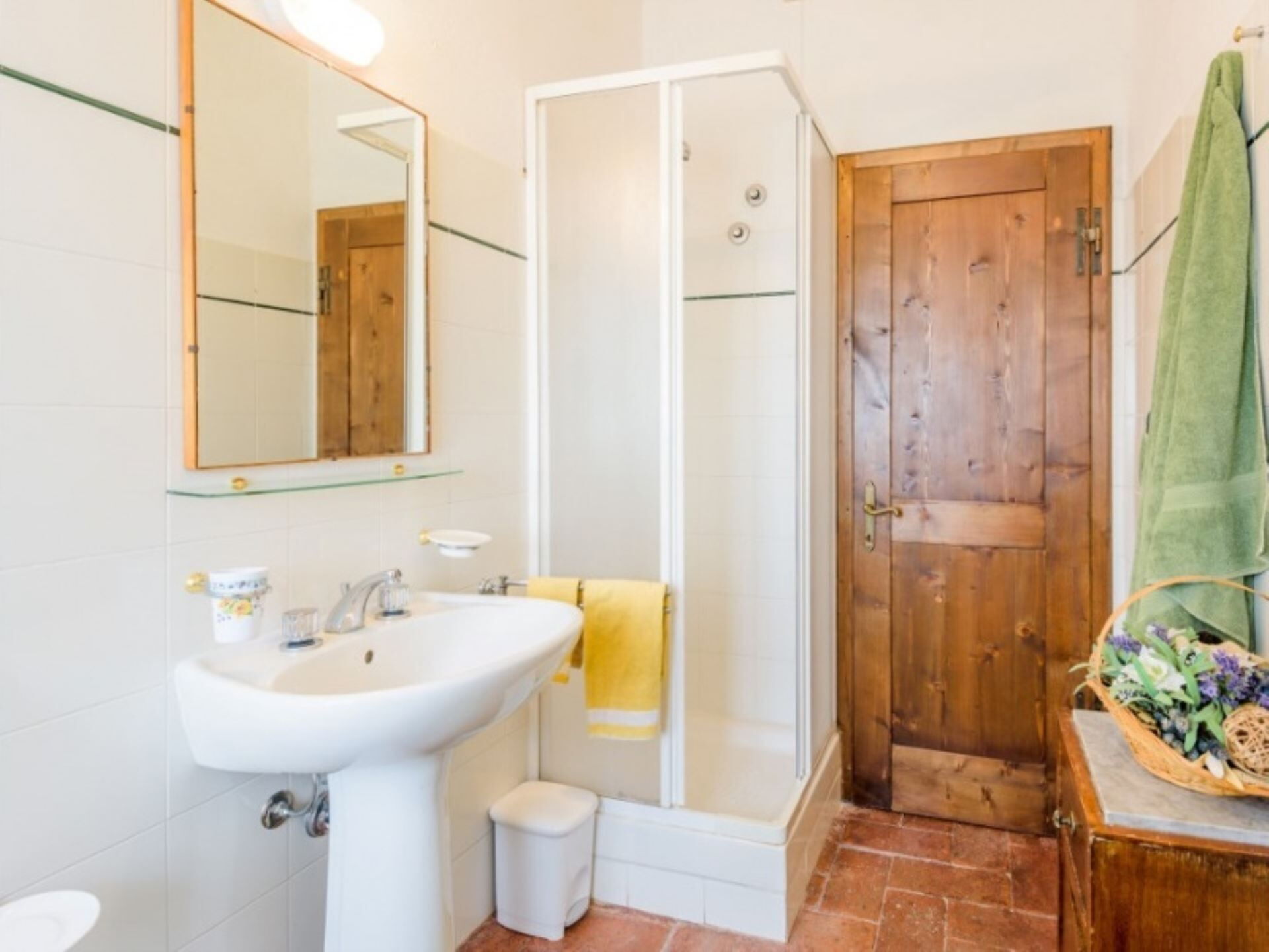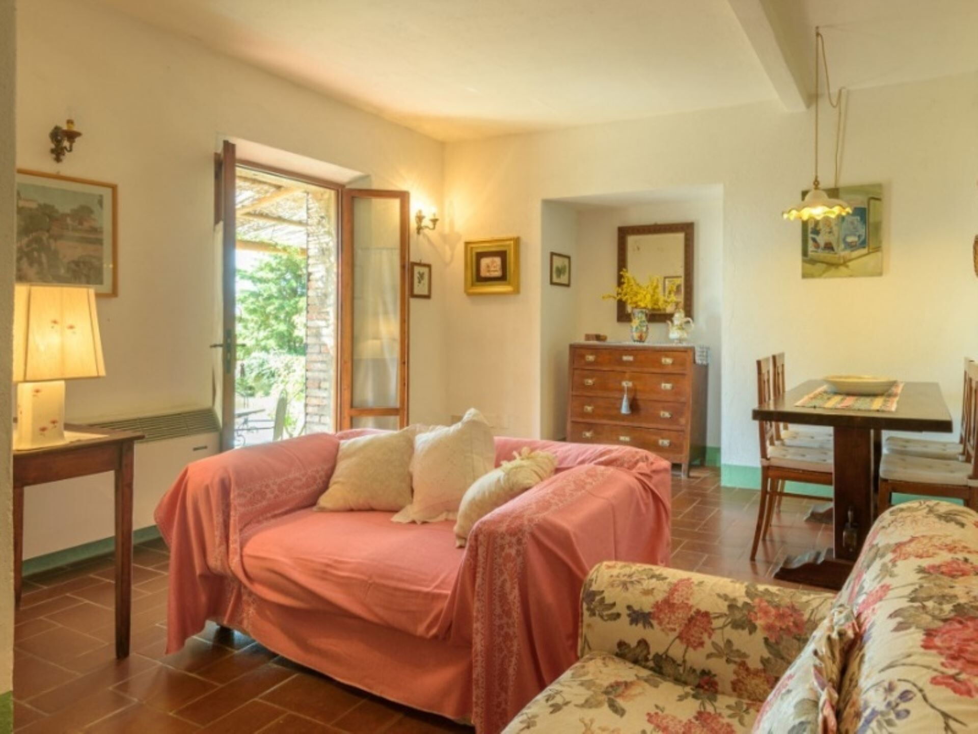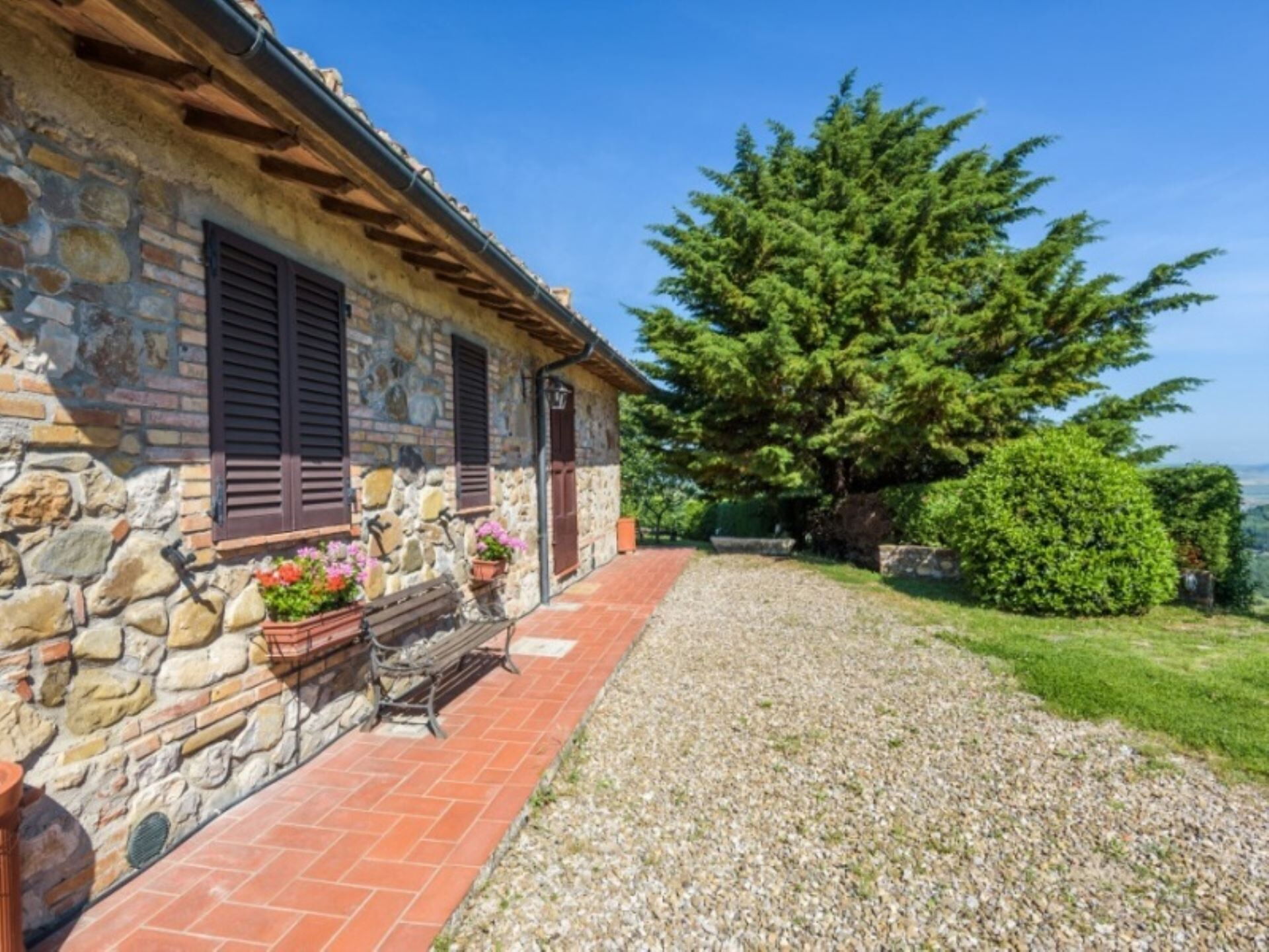 Los espacios exteriores de Podere del Mezzadro ofrecen áreas excepcionales para la relajación y el entretenimiento. Disfrutará de una piscina panorámica no climatizada de 8 x 4 metros con una profundidad que varía de 1,20 a 1,40 metros, vallada por seguridad y abierta del 1 de mayo al 31 de octubre. La propiedad cuenta con un amplio jardín que rodea la casa de labranza, proporcionando abundante espacio para actividades al aire libre y ocio. Una encantadora pérgola de jazmín se extiende desde la casa, creando un área sombreada donde podrá cenar al aire libre en cómodas mesas de hierro con sillas. Encontrará mobiliario exterior estratégicamente distribuido por todo el terreno para maximizar su disfrute de las impresionantes vistas. Hay disponible una zona de barbacoa para preparar comidas al aire libre, y los niños disfrutarán del parque infantil dedicado. Los apartamentos de la planta baja se abren directamente a la pérgola de jazmín, mientras que el apartamento Lavanda proporciona acceso a través de una puerta francesa al amplio césped trasero. El apartamento Oleandro da a un pequeño rincón verde y apartado de la finca, ofreciendo privacidad y tranquilidad adicionales.