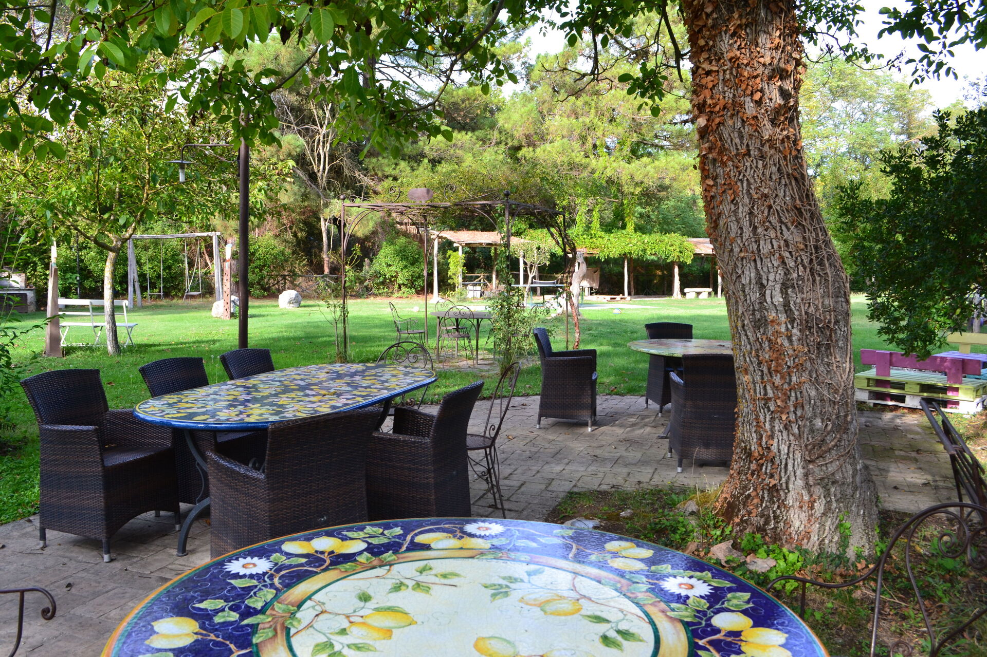 La capacidad habitable de toda la propiedad es de 48 personas; en el jardín hay un espacio exterior cubierto muy grande donde la gente puede comer junta.