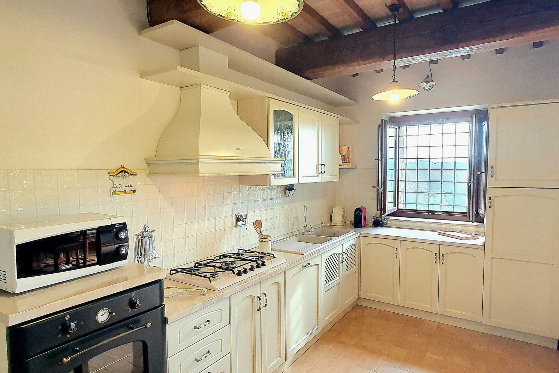 The interiors radiate classic charm with handmade terracotta floors, beamed ceilings, and terracotta tiles adding to its timeless appeal. On the ground floor, a spacious living room with a