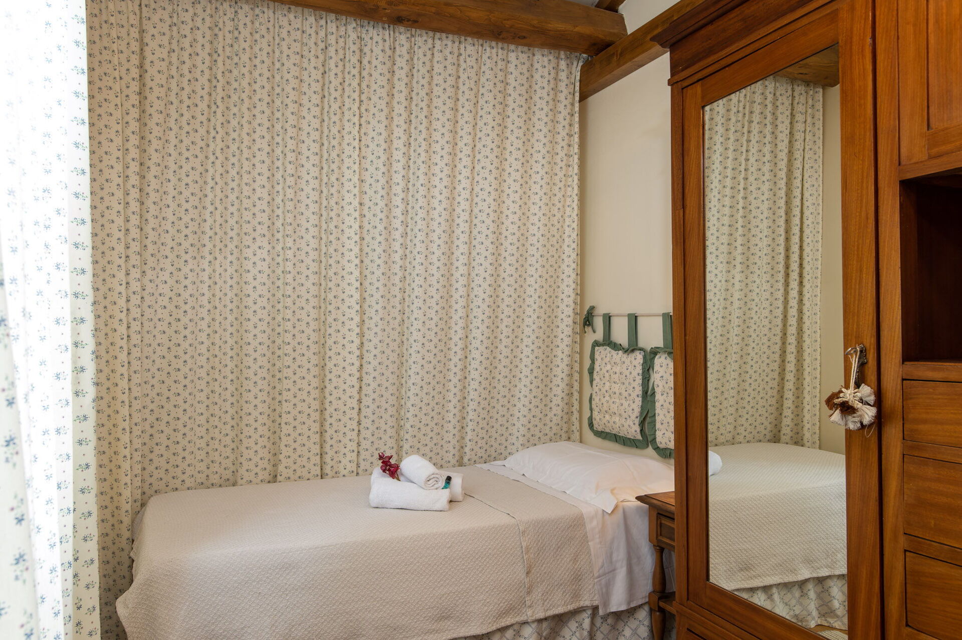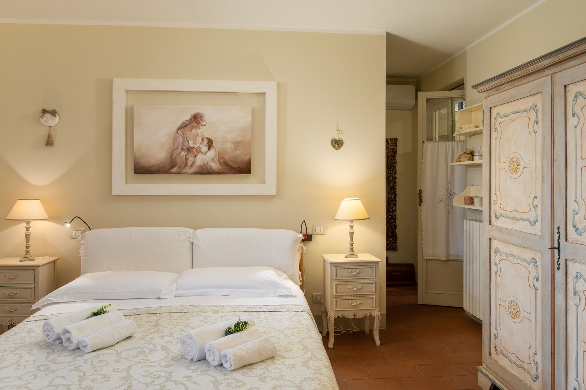 Habitación con baño: cama doble (ancho: 160m, longitud: 200m), cuna, WIFI internet, WIFI internet, aire acondicionado, sillón, escritorio, lavabo, bidé, ducha, secador, acceso al jardín.