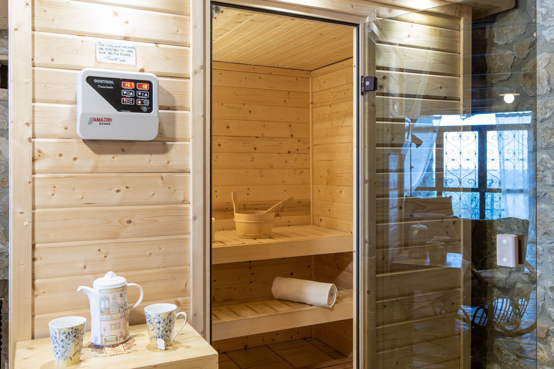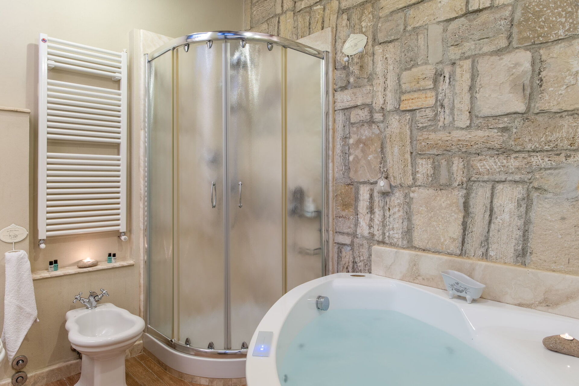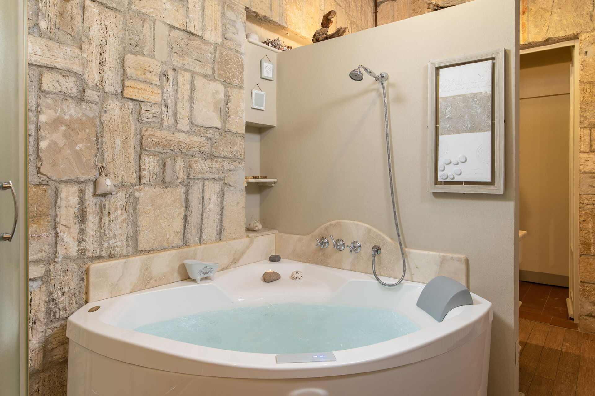 Habitación con baño: cama doble (ancho: 160m, longitud: 200m), WIFI internet, aire acondicionado, sillón, chimenea, jacuzzi, lavabo doble, bidé, ducha, secador.