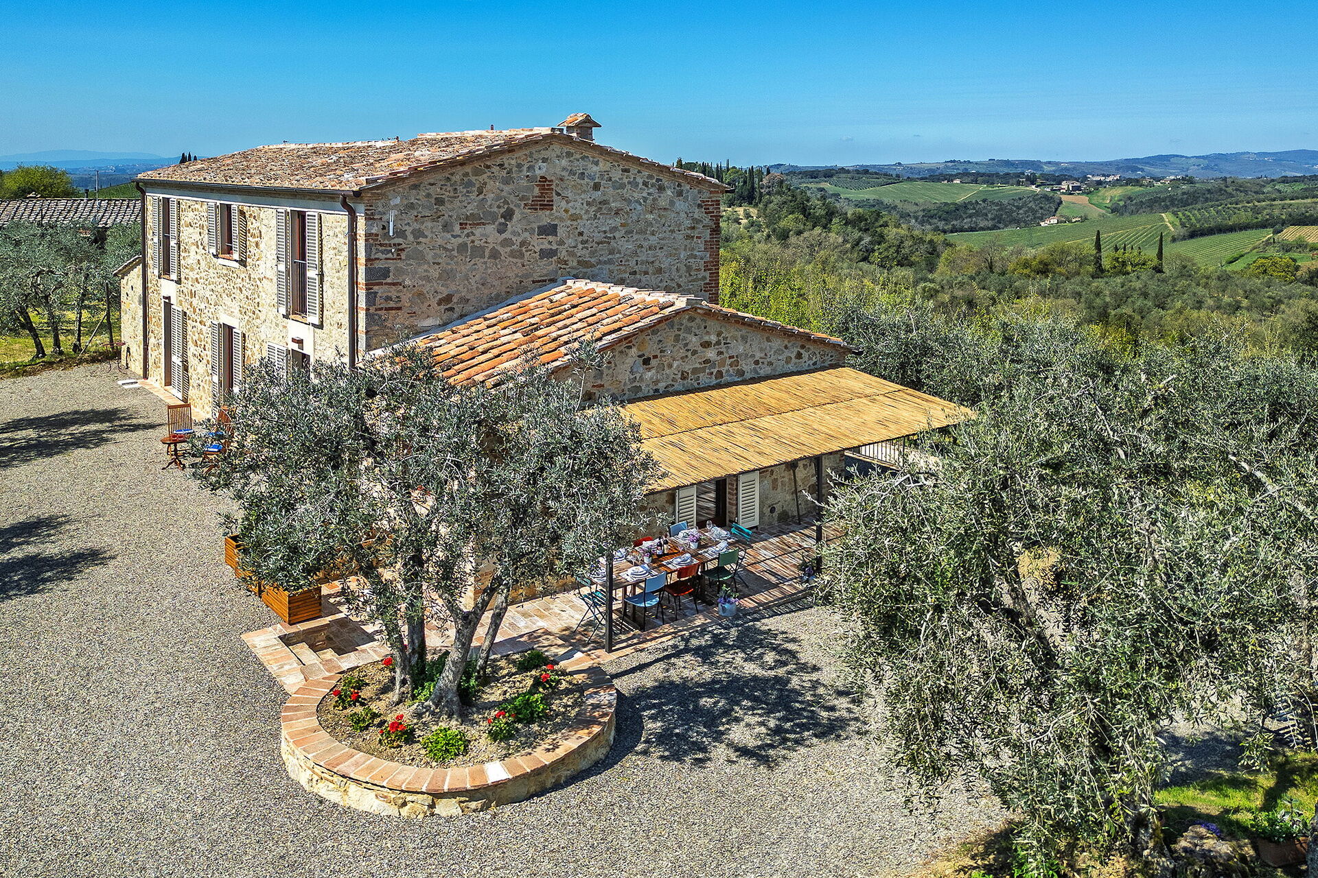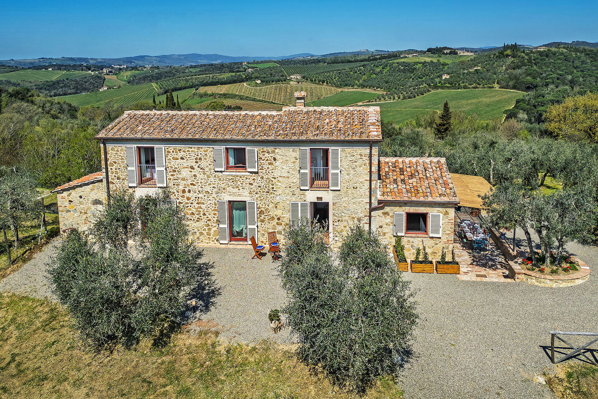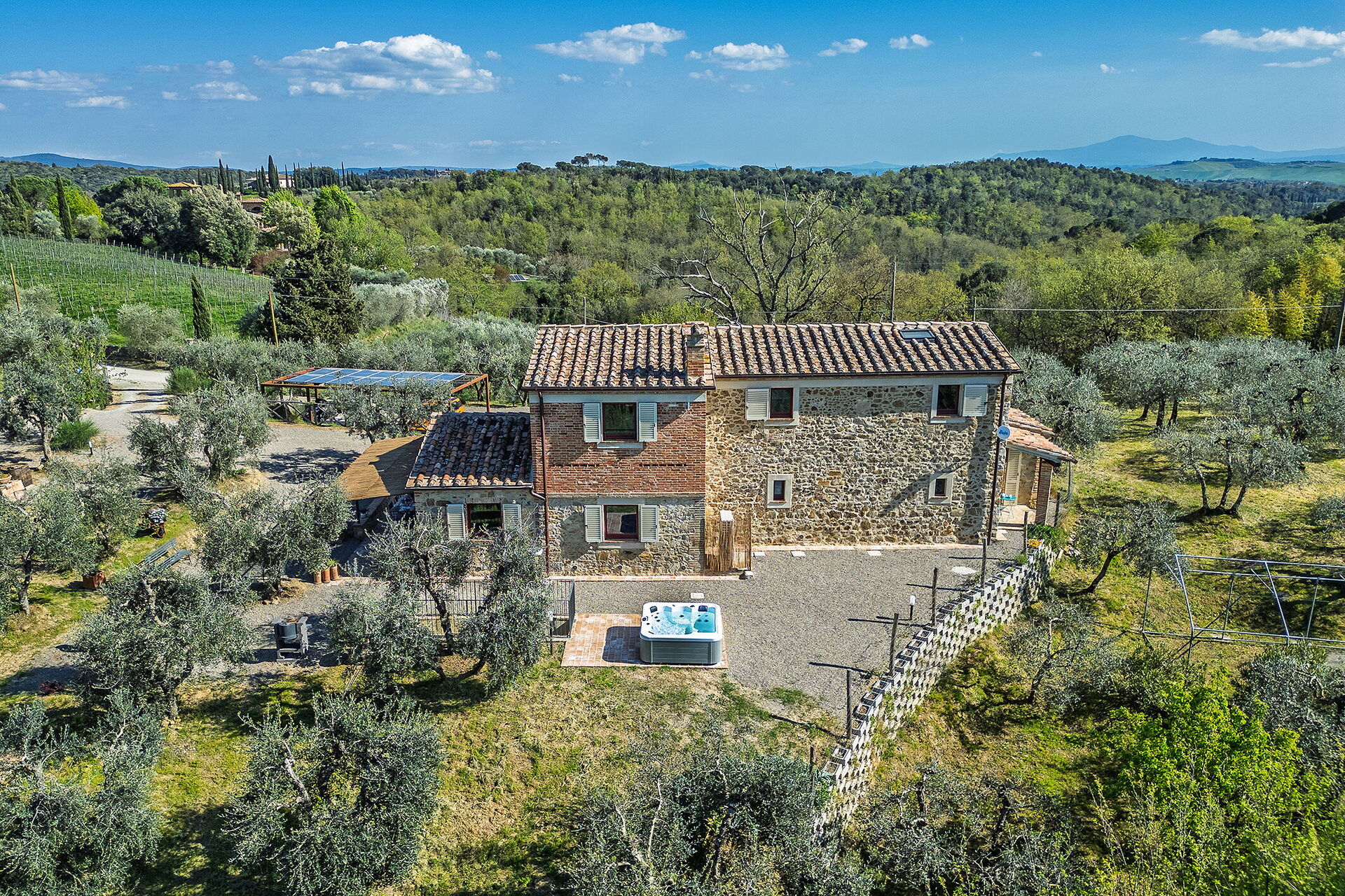 Marielena Authentic Chianti Retreat: Panoramic Vie es una estupenda casa de vacaciones de piedra (250 m2) con aire condicionado, jacuzzi y WiFi. La propiedad puede acoger cómodamente ocho personas en cuatro habitaciónes con cuatro baños. La propiedad está situada sólo 590 m de distancia de Castell'in Villa (Italia), en la zona turística "Siena y Alrededores" y sólo a 21 km de distancia desde Siena.
