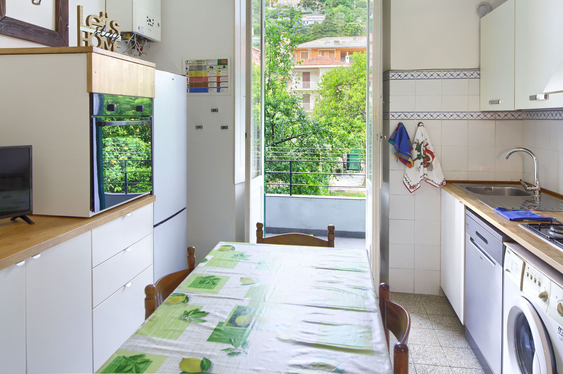 Cocina muy bien equipada: lavavajillas, lavadora, placa de 4 fuegos, horno, frigorífico, congelador y fregadero. Cafetera Nespresso, cafetera americana, moka italiana, hervidor eléctrico, tostadora, batidora de mano y exprimidor. Mesa de comedor con sillas y TV.