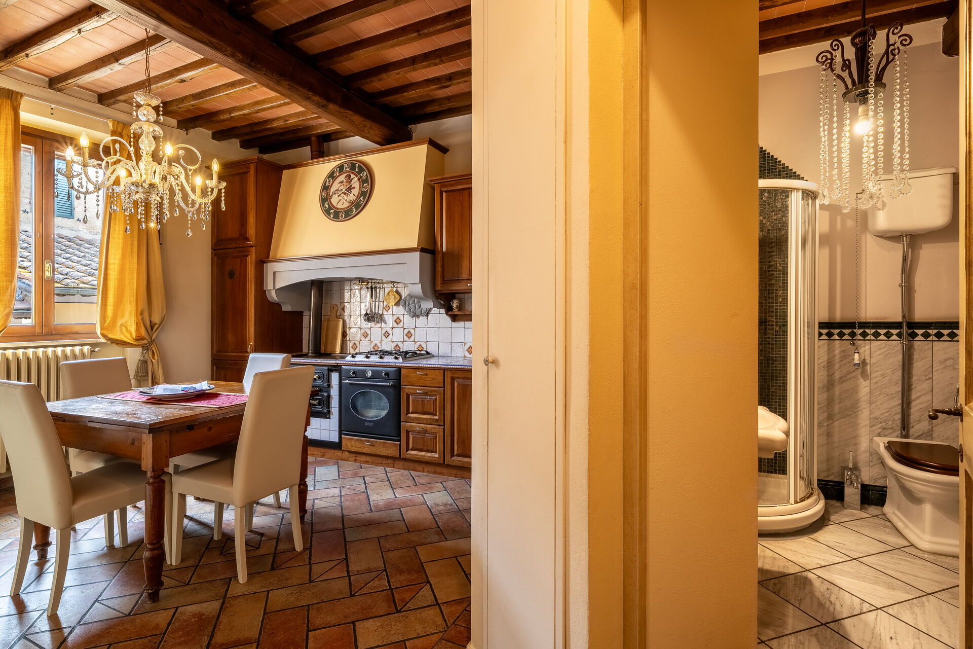 Después de llegar encontrará una estupenda propiedad limpia y acogedora con vista ciudad ideal para unas vacaciones tranquilas en Toscana. Uno de los beneficios de estar en una casa de vacaciones sino que en hoteles, es la posibilidad de relajarse tras un largo día de visitas con la familia y los amigos. Al anochecer sigue disfrutando con una buena comida y un buen vino local. Si le gusta cocinar para su familia y amigos hay una cocina bien equipada incluso máquina de café, microondas, estufa y nevera, así como , muchas vajillas y cubiertos para hasta cinco personas.