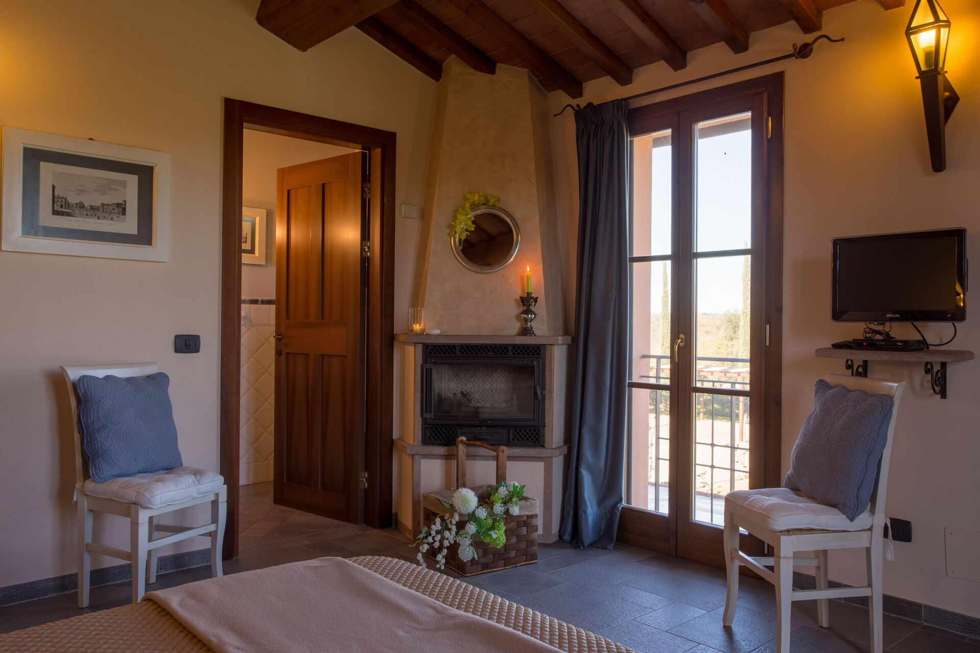 Habitación con baño 2: cama doble, cama individual, WIFI internet, aire acondicionado, mosquitero, tv vía satélite, chimenea, lavabo, baño, bidé, ducha.