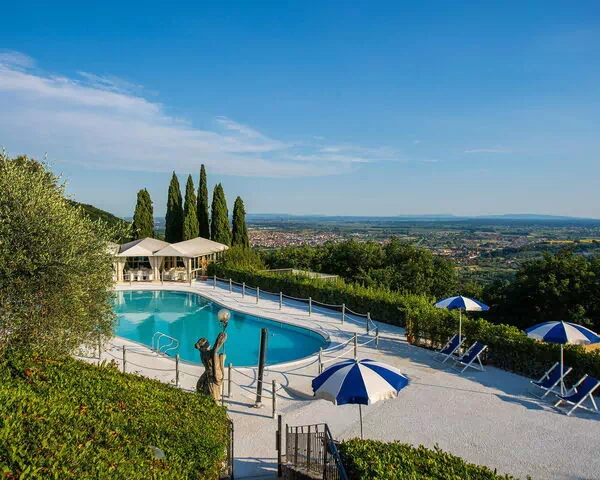 Los espacios exteriores de Villa la Brezza se desarrollan a través de múltiples terrazas cuidadosamente ajardinadas, cada una adornada con fuentes y rincones íntimos. La piscina privada puede calentarse bajo solicitud y está equipada con tumbonas y sombrillas. Un gazebo cubierto proporciona un espacio sofisticado y versátil junto a la piscina. Las terrazas ofrecen vistas del valle circundante y son ideales para disfrutar al atardecer, cuando la luz dorada ilumina las antiguas colinas y valles.