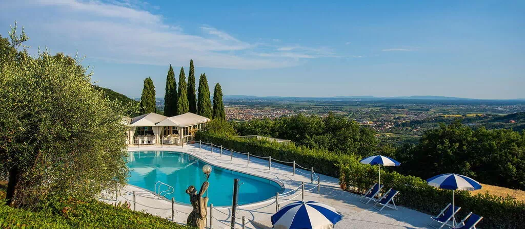 Villa la Brezza es una villa de estilo moderno ubicada en Pieve A Nievole, en el corazón de la Toscana, Italia. Posicionada en Montecatini Alta, la propiedad domina vistas panorámicas excepcionales sobre las colinas toscanas y la histórica ciudad de Montecatini Terme. La villa está rodeada por un magnífico jardín privado que envuelve toda la propiedad, proporcionando una sensación de aislamiento y tranquilidad. Una piscina privada ocupa un lugar central en el paisaje exterior, perfectamente posicionada para dominar el valle inferior.