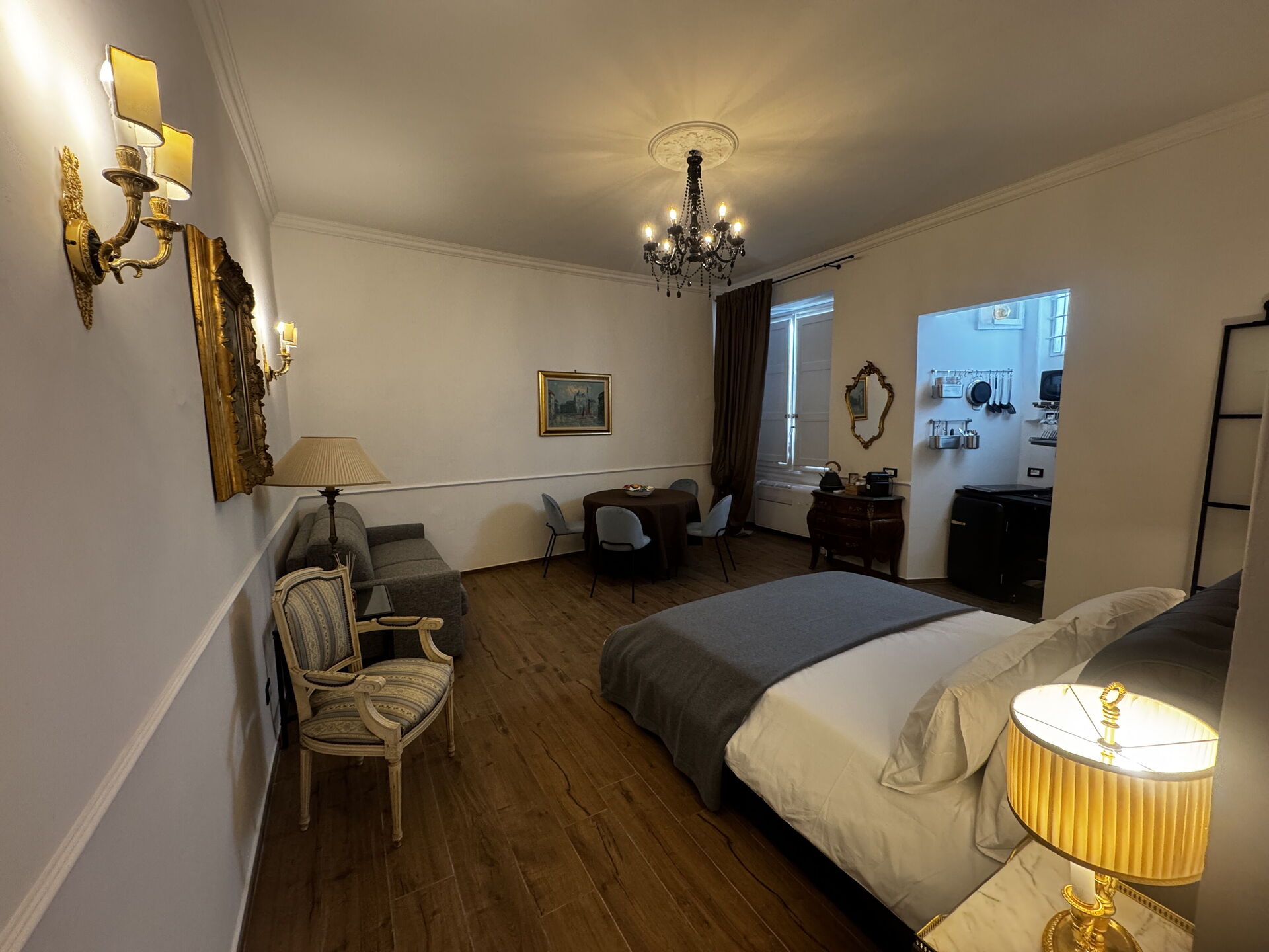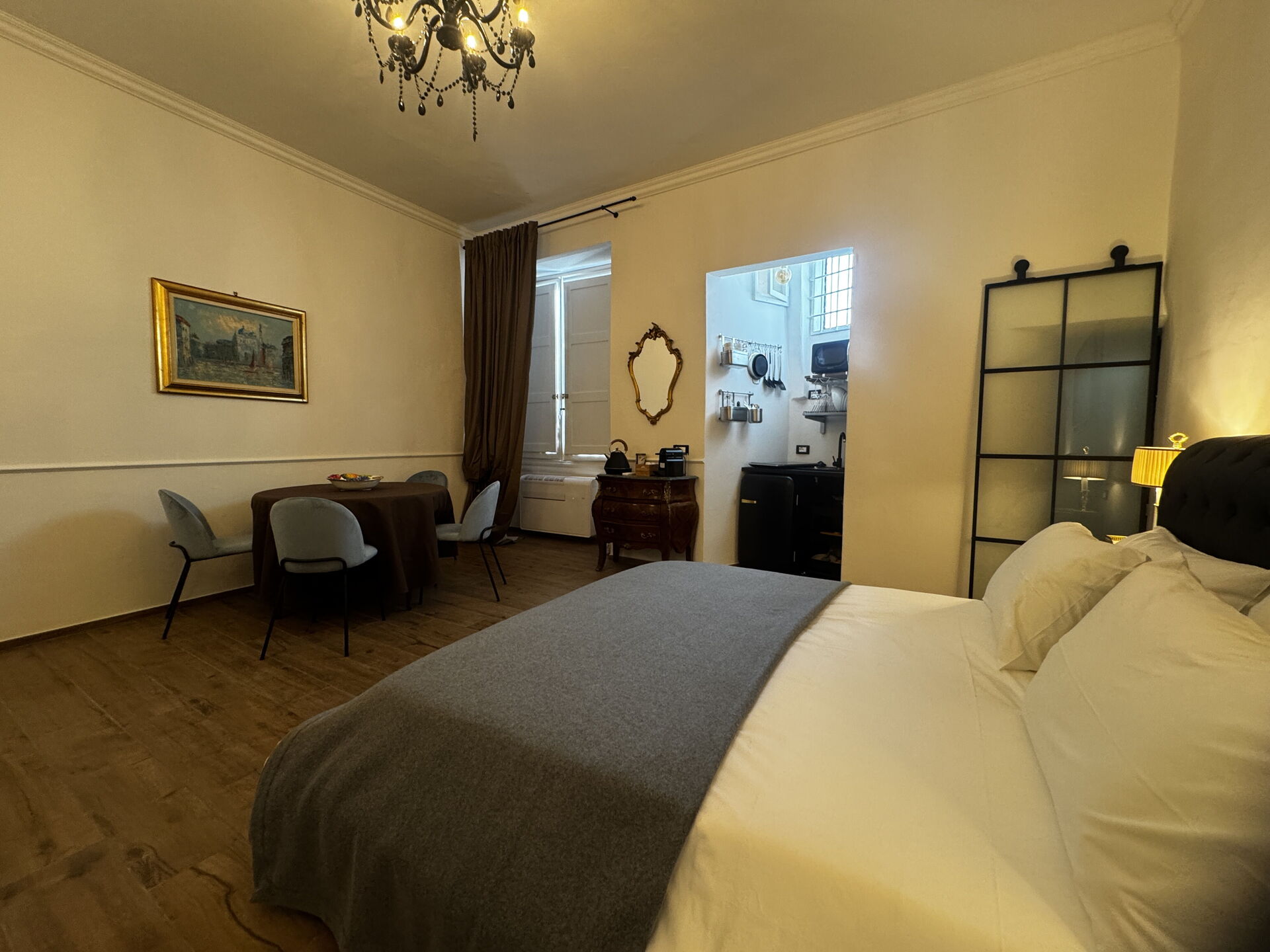 Espacio abierto: mesa de comedor, cama doble, sofá cama de matrimonio, WIFI internet, aire acondicionado, frigorífico, cocina de gas, congelador, plancha, cocina bien equipada, microondas, máquina de café italiana.