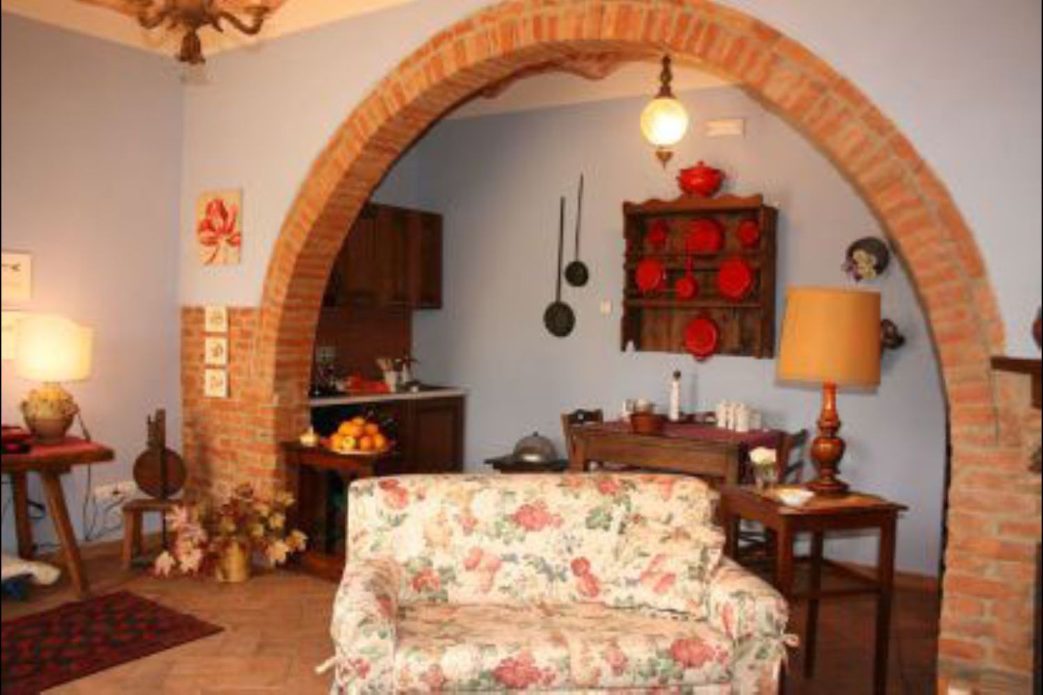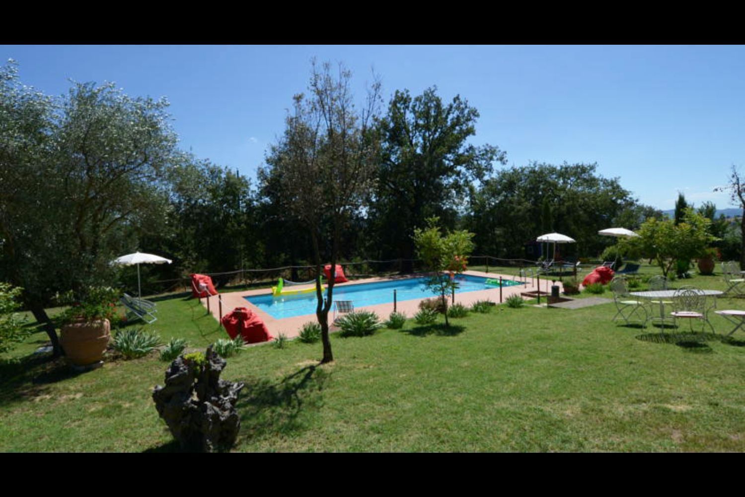 Spacious equipped green space, swimming pool, typical dinners on request. Around the house a large, green space equipped with sun umbrellas, tables and chairs to eat in the open air and where you also find the beautiful swimming pool (size mt 6x12, depth mt 1,20). The common room, next to the main house, with kitchen, barbecue and bathroom with shower, is the place where you could join in and where will be possible to cook and eat all together, or otherwise on request, the owner can prepare typical dinners. Furnishing cured and comfortable with beautiful antiques, fits in perfectly with the farmhouse features. Possibility to organize trekking courses with horses.